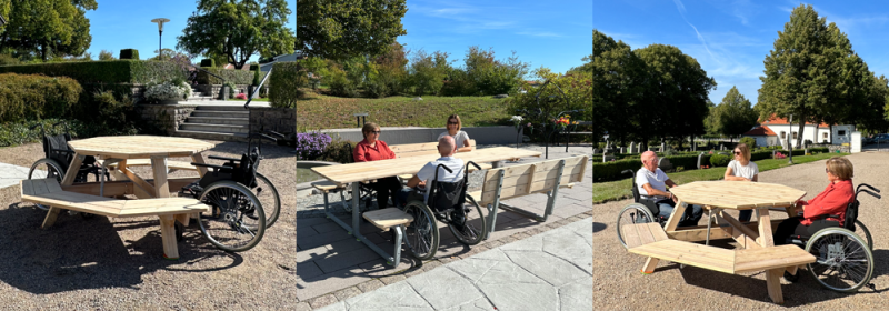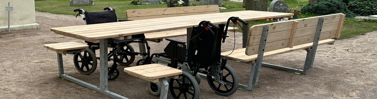 Kyrkan är en viktig mötesplats för dom som vill besöka sina anförvanter. Med våra tillgänglighetsanpassade utemöbler inkluderas alla människor på olika sätt. Möblerna erbjuder specialdesignade platser för rullstolsburna, bänkbord med arm- och ryggstöd samt möbler med en unik lösning som gör att människor med nedsatt rörelseförmåga enkelt kan gå in och sätta sig.