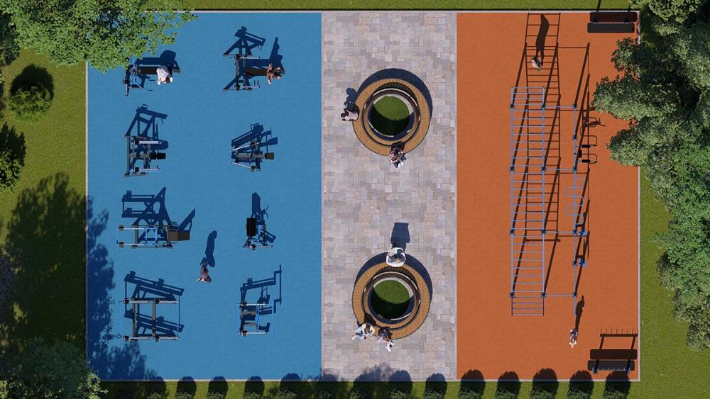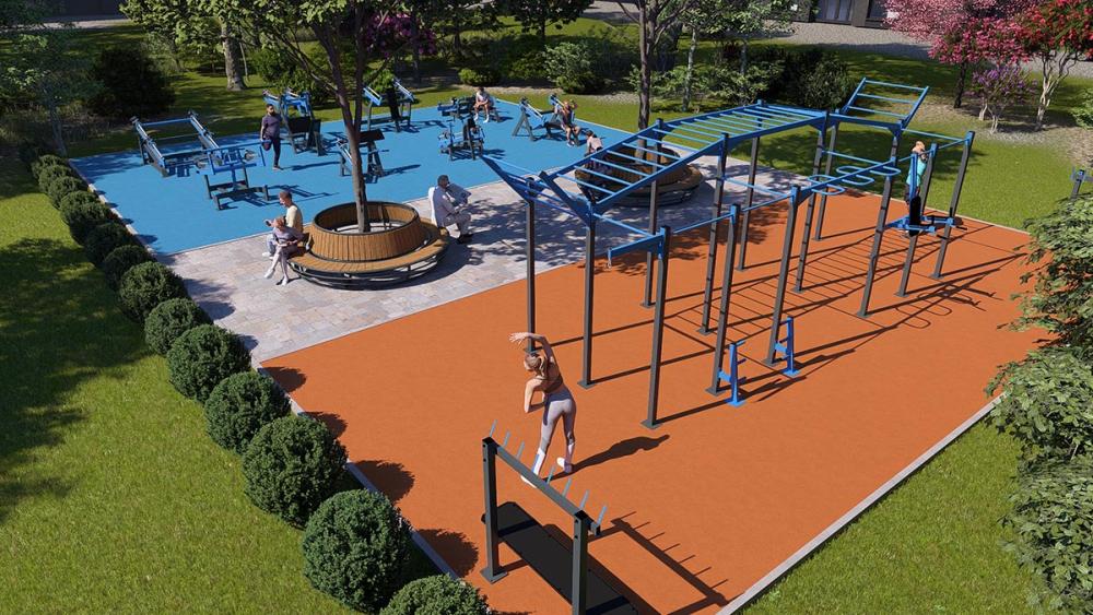 Träningsutrustning för vuxna bör inte placeras direkt intill lekredskap som omfattas av EN 1176 utan tydlig avgränsning. I många projekt separeras utegym och lekplats med avstånd, nivåskillnad, plantering eller staket.