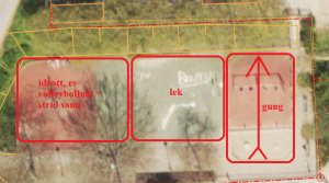Underlag från kund, grov skiss med förklaring att område för gunglek och volleyboll samt lekområde för småbarnsåldern önskades.