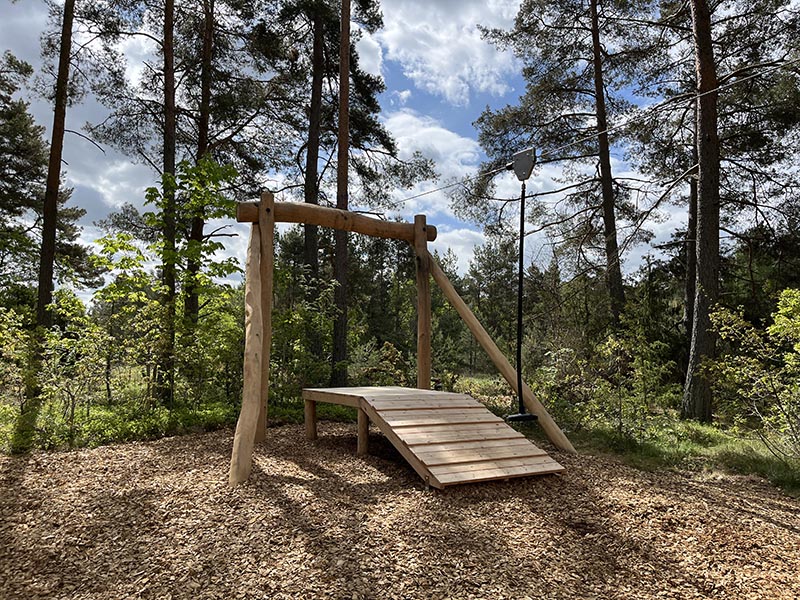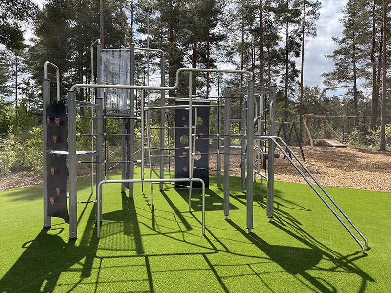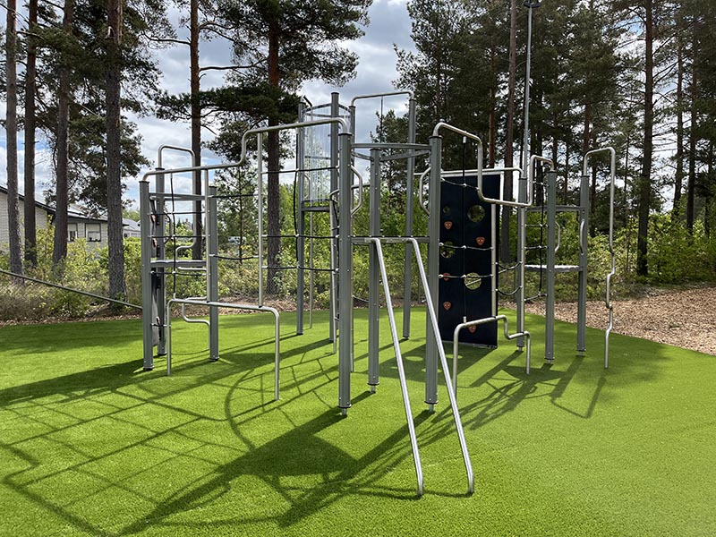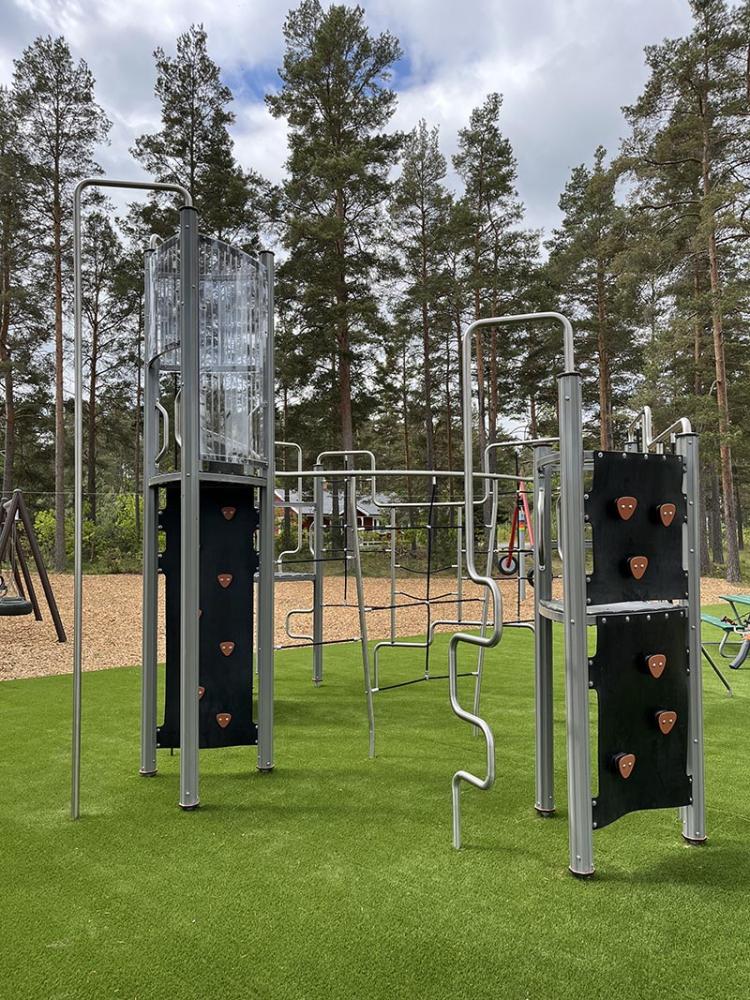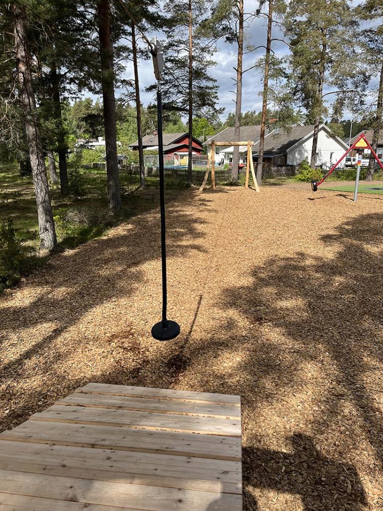 Här finns en spännande klätterställning för äventyrliga barn, en studsmatta nedfälld i marken som bjuder in till hopp och skratt – och som kronan på verket: en 30 meter lång linbana som snabbt blir en favorit bland både stora och små. En stor nyhet är också att området nu omfattar cirka 250 m² konstgräs, vilket skapar en mjuk, jämn och inkluderande lekmiljö.