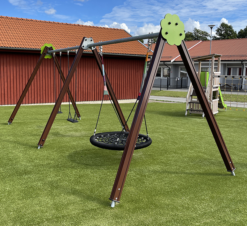 För gunglek finns en fyrplatsgunga med bruna aluminiumstolpar, kompletterad med en kompiskorg och två plansitsar, vilket ger möjlighet till både gemensam och individuell lek. En tillgänglighetsanpassad karusell med plats för två rullstolar gör det möjligt för fler elever att delta i snurrlek på lika villkor.