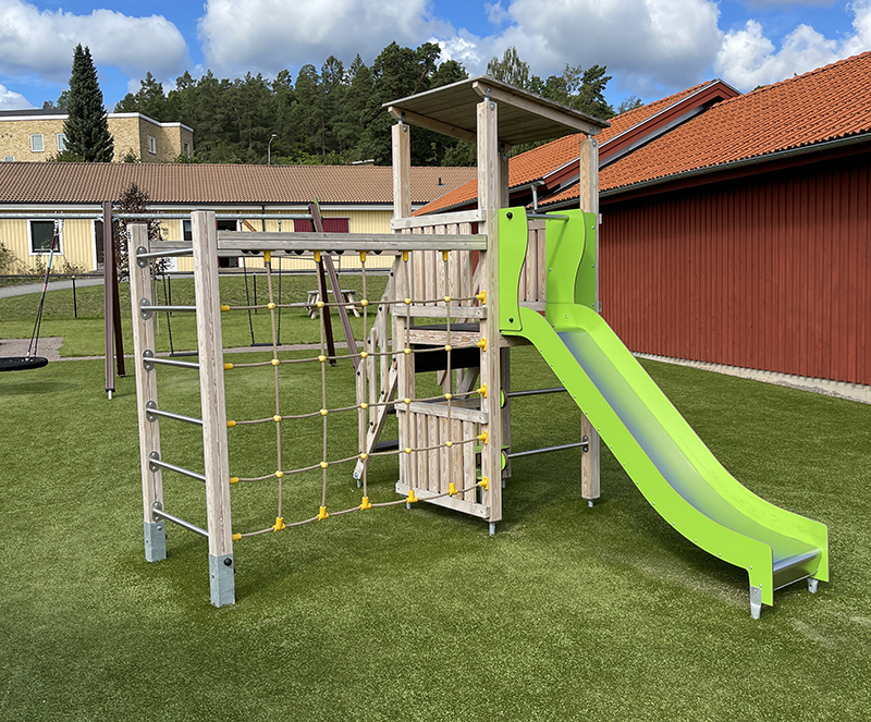 Lekplatsen innehåller flera genomtänkta lek- och aktivitetsfunktioner som tillsammans skapar en varierad och inkluderande helhet. Den tillgängliga klätterleken Signe, utförd i Organowood, erbjuder klätterlek på en nivå som är både trygg och stimulerande. Materialvalet ger ett naturligt uttryck samtidigt som det är hållbart för skolmiljö.