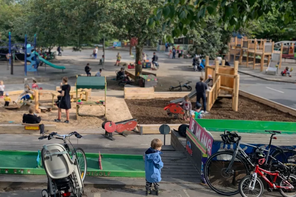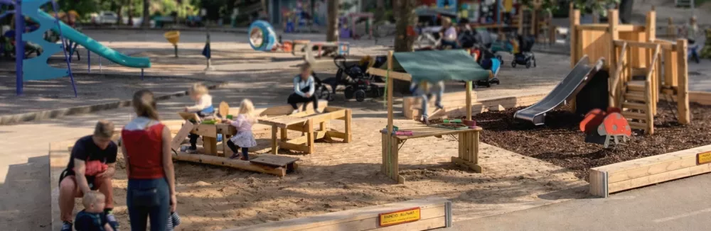 Förslaget visar hur lekredskap kan kombineras för att skapa lek som fler kan ta del av, även på begränsad yta i en tät stadsmiljö. T ex. så öppnades befintlig sandlåda upp varit en sandlek integrerades, upphöjda sandbakbord kompletterade- och utökade möjligheten till sandlek för fler barn och gångvägar av trall ledde in till gemenskapen.