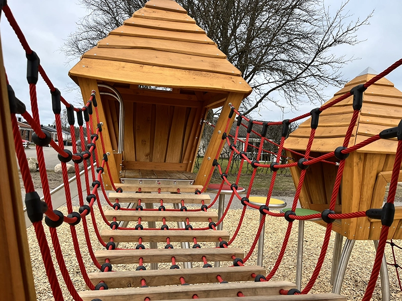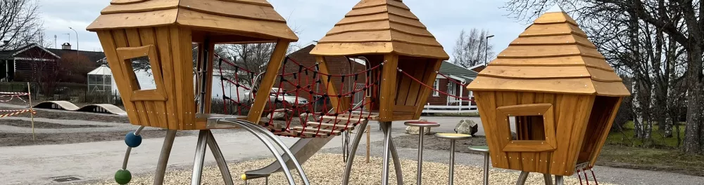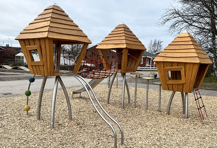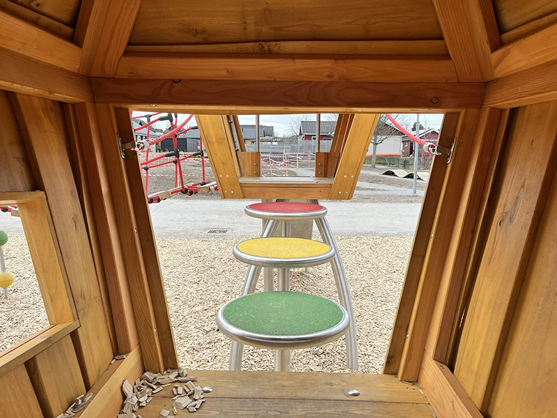 Kojorna fungerar som små utsiktspunkter och mötesplatser och bjuder in till rollekar, samspel och upptäckande lek. Den öppna utformningen gör att barnen hela tiden har visuell kontakt med varandra och med omgivningen, vilket bidrar till både trygghet och lekglädje.