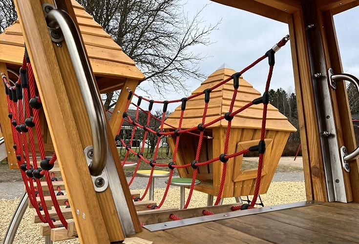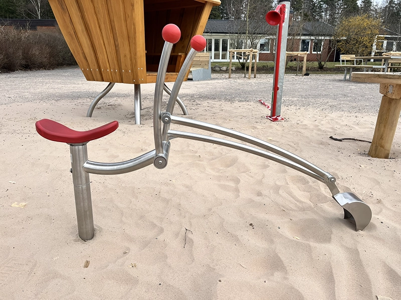 Materialmässigt kombineras varma träytor med bärande konstruktioner i rostfritt stål, vilket ger ett lätt och modernt uttryck samtidigt som lekutrustningen är robust och anpassad för långvarig användning i offentlig miljö.