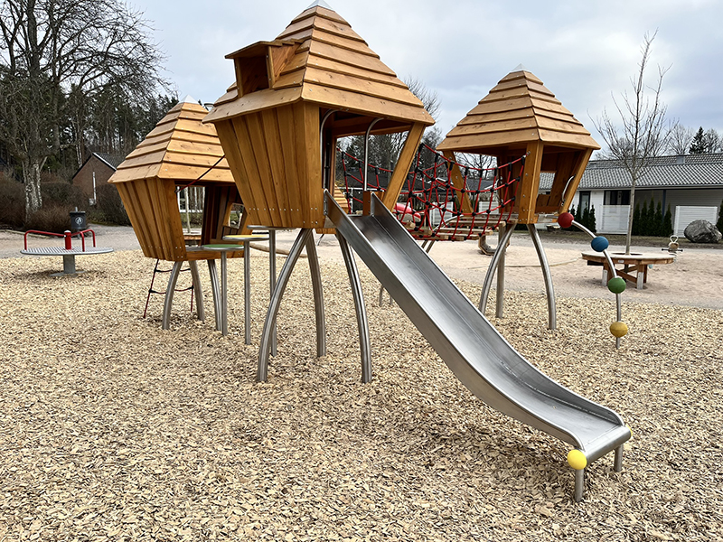 I detta projekt stod Växjö kommun för projektering och utformning av lekplatsen. Med tydliga handlingar och genomarbetad planering valdes lekutrustning som både stödjer platsens funktion och förstärker det visuella helhetsintrycket.