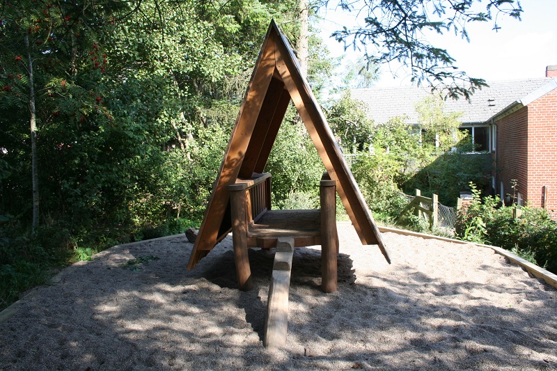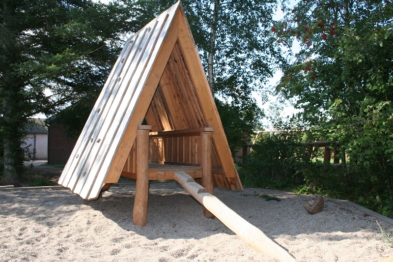 Bali hus på 1,8 x 1,8 m. Huset är något upphöjd över marken och accessas via en balansbom som har två steg.
