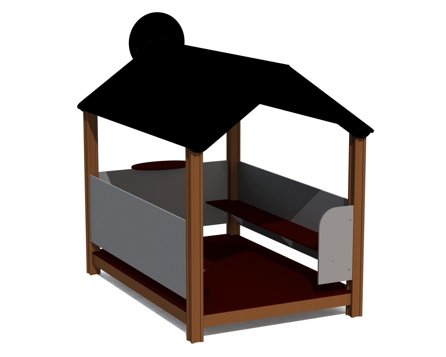 Ett större lekhus med bänkar på vardera sida samt en överskjutande affärsdisk som ges åtkomst för alla barn även från utsidan.
