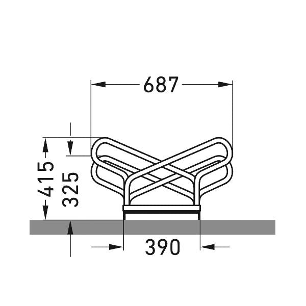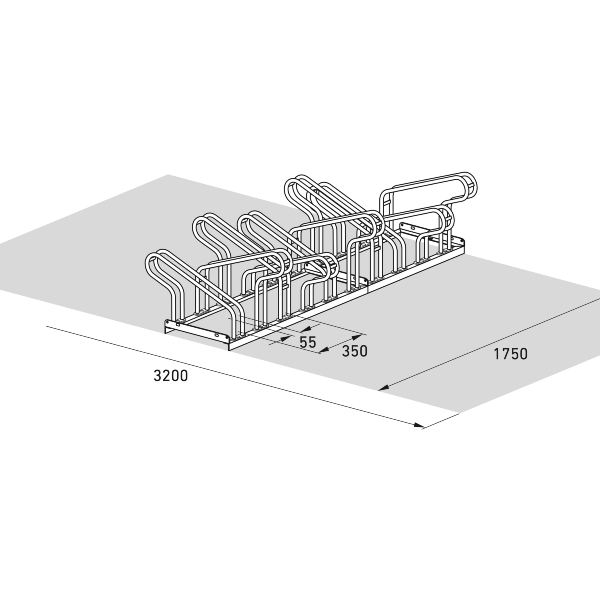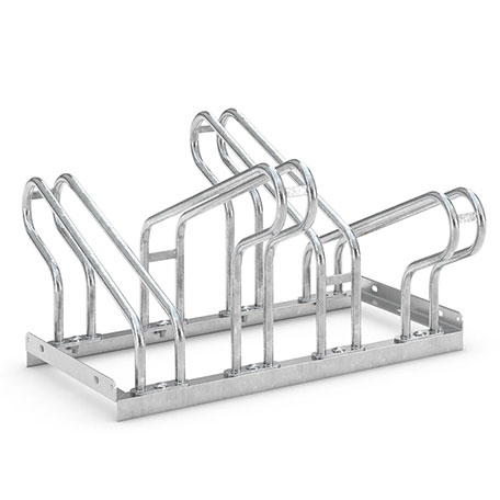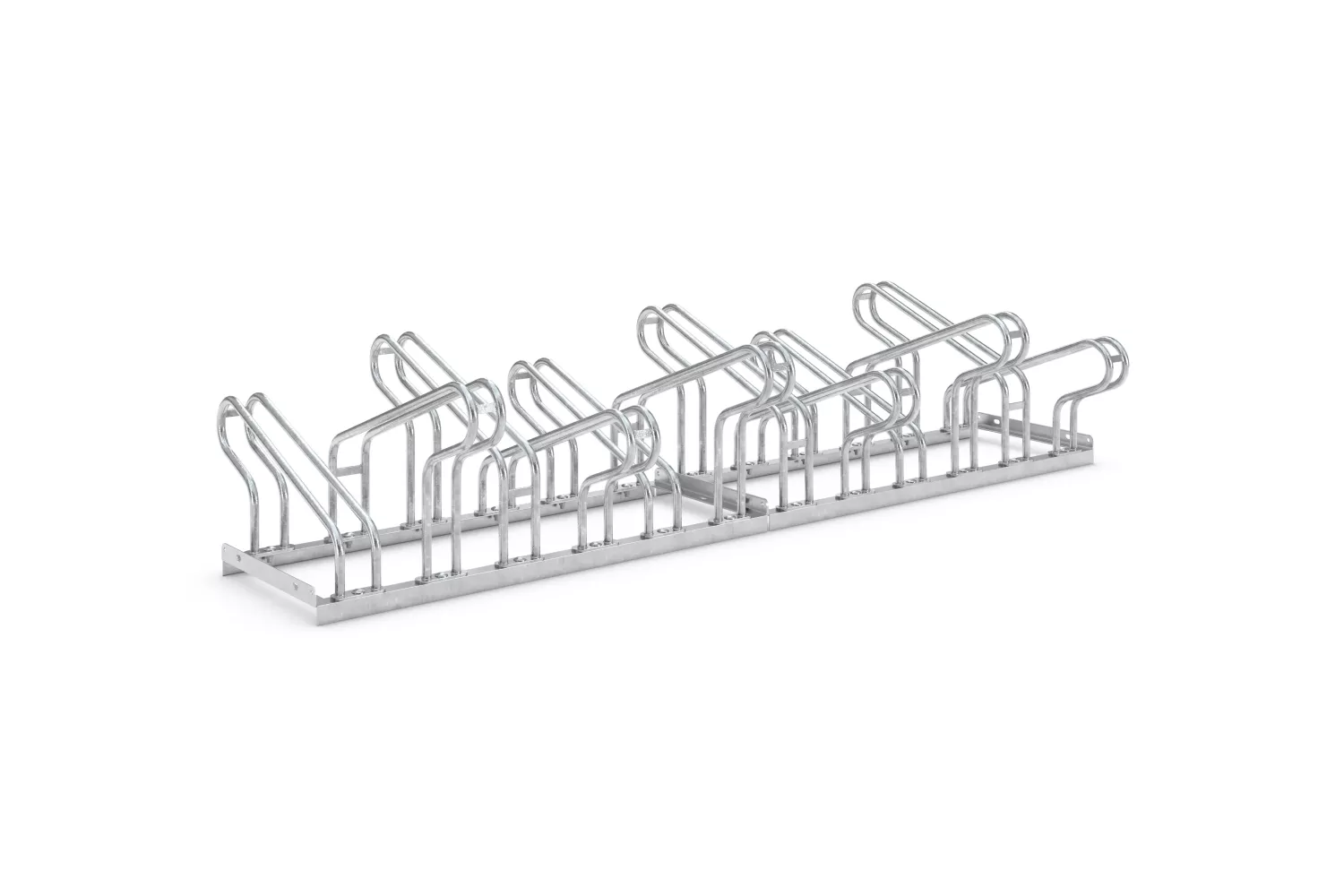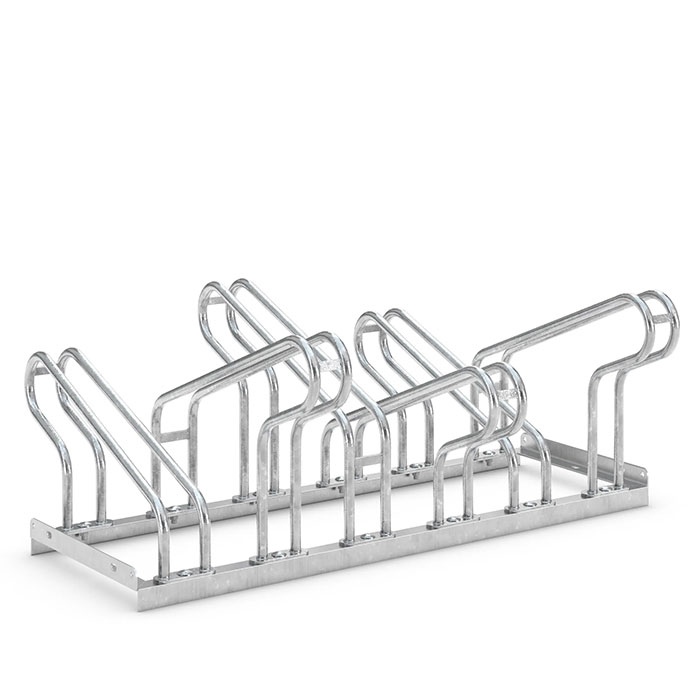 Dubbelsidigt cykelställ av hög kvalité där cyklar kan parkeras från båda hållen. Varje hållare är monterad 175 mm (350 mm per sida) ifrån varandra och vartannat ställ per sida är växelvis högt/lågt. Tack vare den breda hjulhållaren på 55 mm får även breda cykelhjul plats.