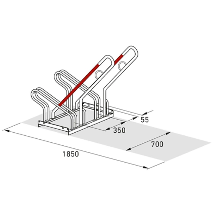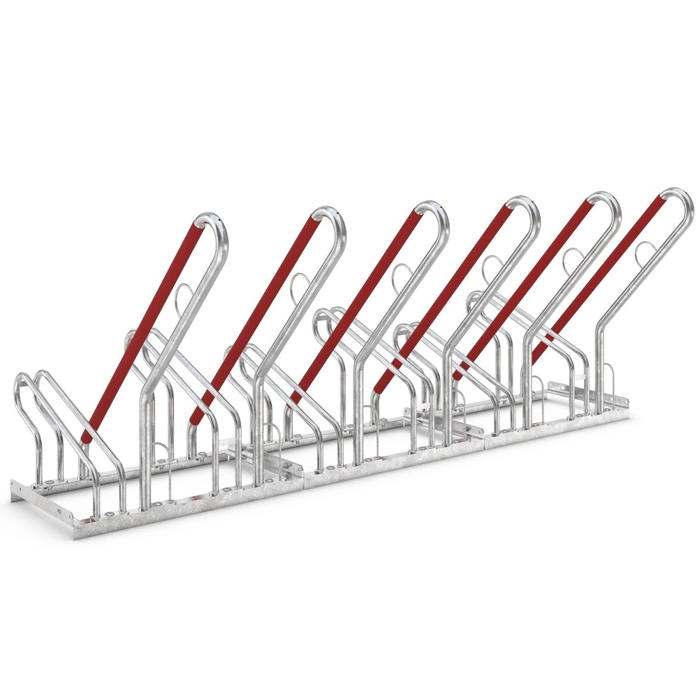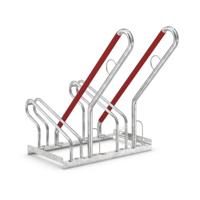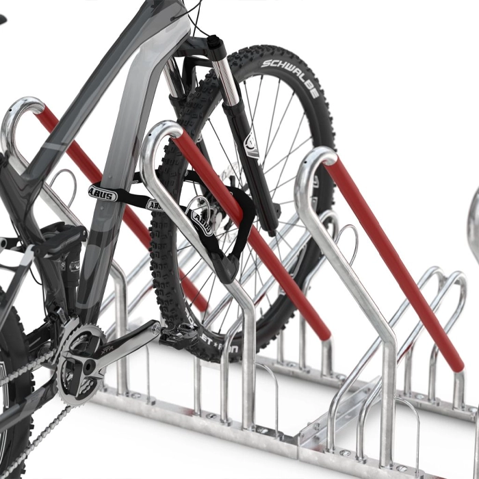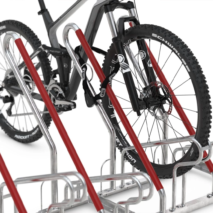 En tydlig detalj är de vinklade lutningsbyglarna, klädda i signalröd plast, som effektivt förhindrar att cyklar välter eller knuffas omkull och därmed skyddar fälgarna. De integrerade stålöglorna ger extra säkerhet genom enkel fastlåsning. Cykelstället är väl anpassat för cyklar med däckbredd upp till 55 mm.