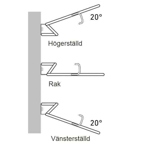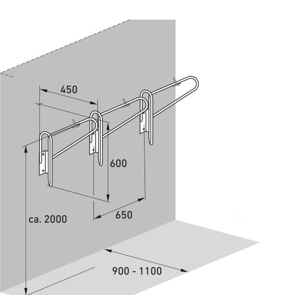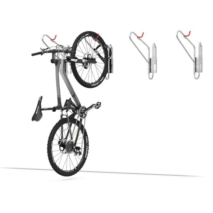 Stället passar alla typer av cyklar och däckbredder – från smala landsvägshjul till breda MTB-däck. För att maximera utrymmet finns tre modeller med olika upphängningsvinklar, vilket gör det enkelt att anpassa installationen efter platsens förutsättningar. Rekommenderat monteringsavstånd mellan ställen är 650 mm.