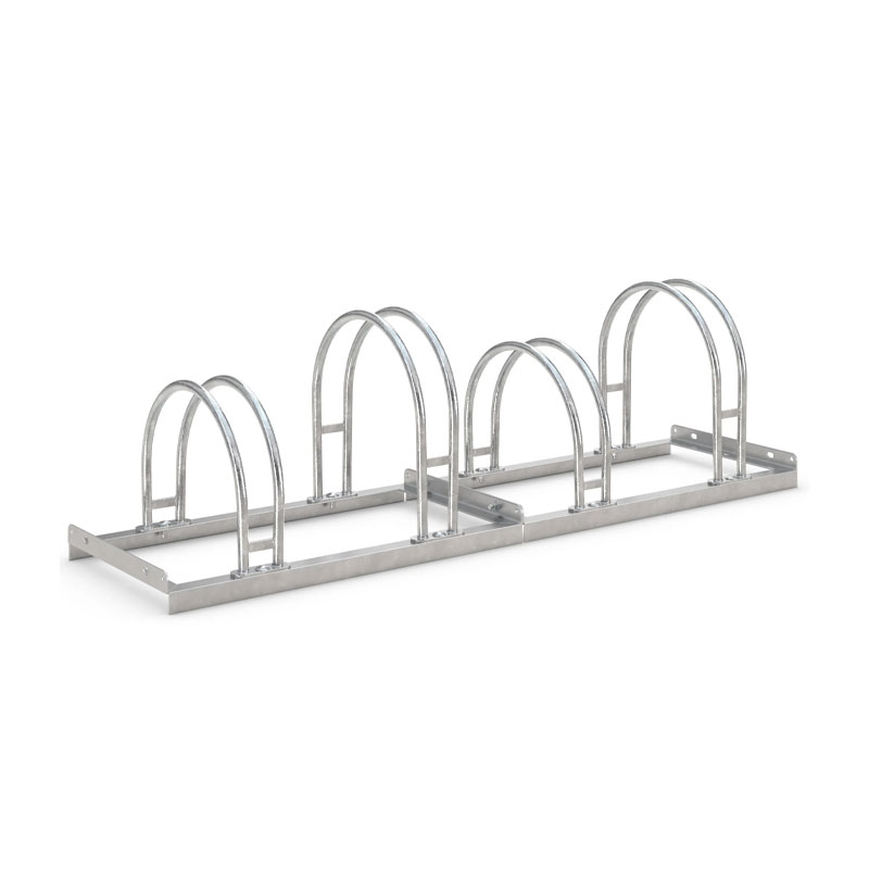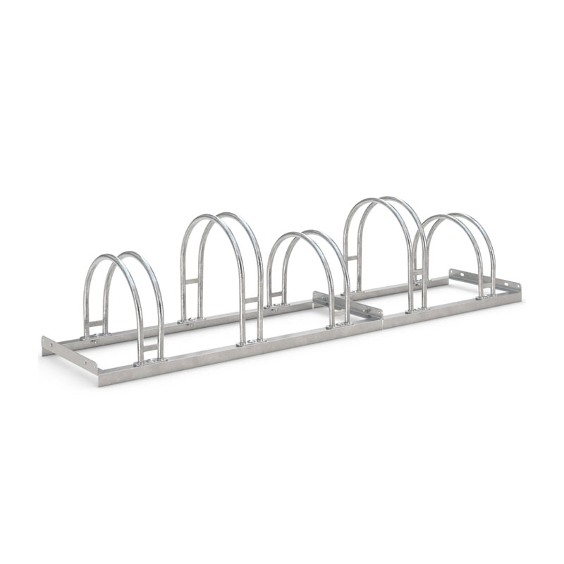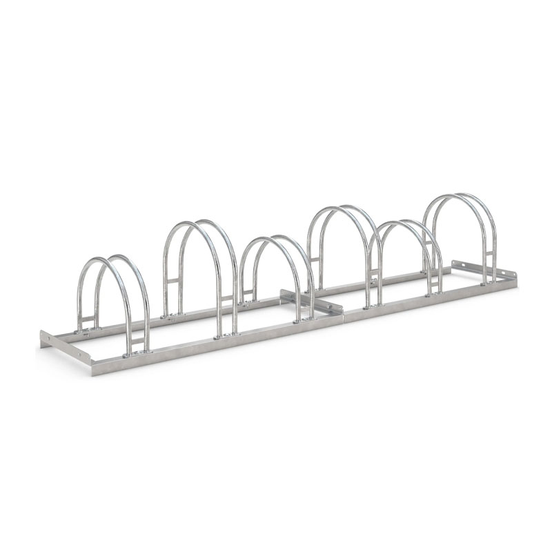 Cykelstället kan byggas ut till valfritt antal platser och det ingår monteringsmaterial för detta. Eftersom varannan plats är hög respektive låg så ska du inte välja att sätt ihop 3- och 5-platsen då båda dessa versionerna har start och slut med låga ställ. Välj då istället 6-platser. För montering i mark med jordankare eller monteringsvinkel finns detta som tillval.