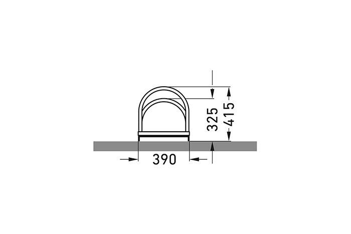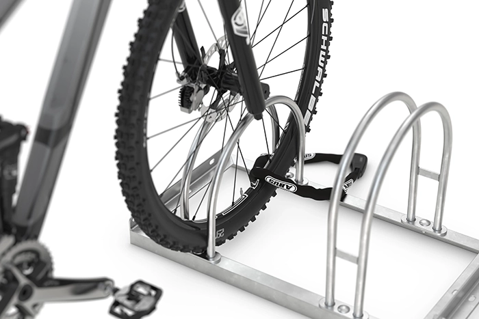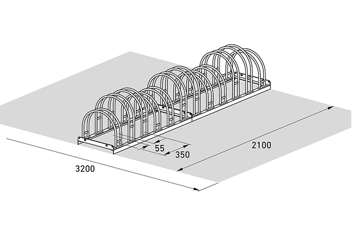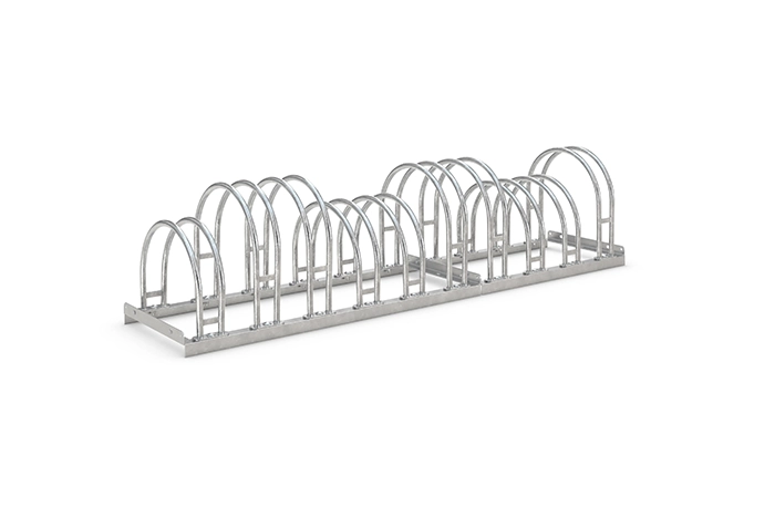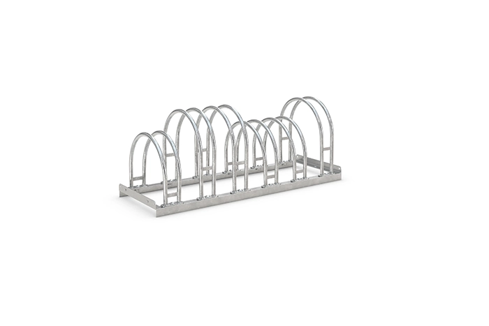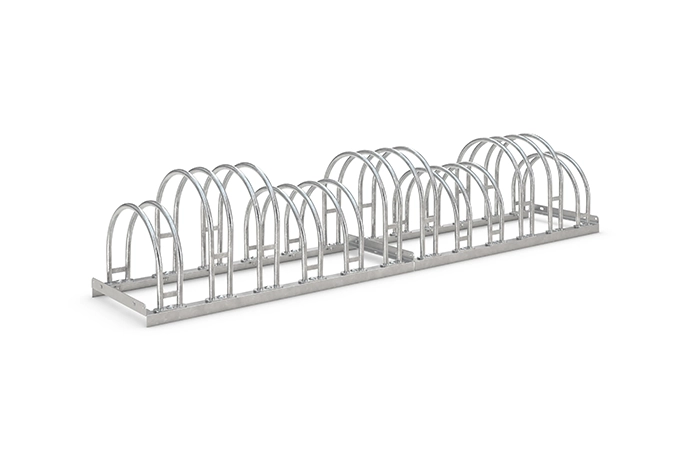 Cykelställ 5000 kombinerar elegant design med praktisk funktionalitet. Med sina diskreta, bågformade byglar erbjuder stället stabil och säker parkering för cyklar – även för modeller med bredare däck upp till 55 mm. Perfekt för platser där både utseende och funktion spelar roll, som utanför butiker, kontor, skolor eller vårdcentraler.