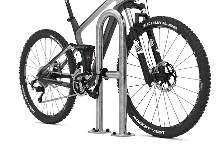 Med sin stabila konstruktion erbjuder den trygga parkeringsplatser för alla typer av cyklar och cykelkärror, samtidigt som den kan användas för att skydda träd, avgränsa ytor eller bromsa trafikflödet på lek- och gårdsgator. Cyklar kan enkelt låsas fast i den horisontella knähöga tvärbågen, vilket ger extra säkerhet.
