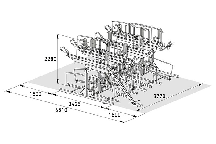 Det integrerade stöldskyddssystemet med flera fästpunkter gör det tryggt att parkera även värdefulla cyklar. Systemet kan levereras med ensidig eller dubbelsidig (denna version)parkering och anpassas efter önskat antal platser.