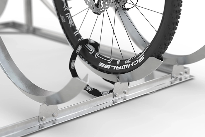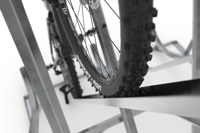 Den vädertåliga stålkonstruktionen passar både inom- och utomhus – i garage, cykelrum eller parkeringsytor – och är enkel att montera. Denna modell (SF-modellen) monteras fristående. Alla modeller är anpassade för cyklar med däckbredd upp till 60 mm och har praktiska fästpunkter för lås direkt i styrskenorna.