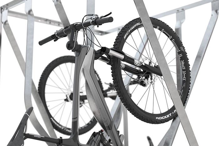 - Platsbesparande snedparkering för cyklar upp till 60 mm däckbredd