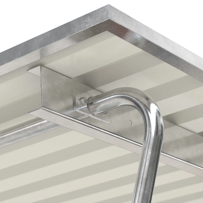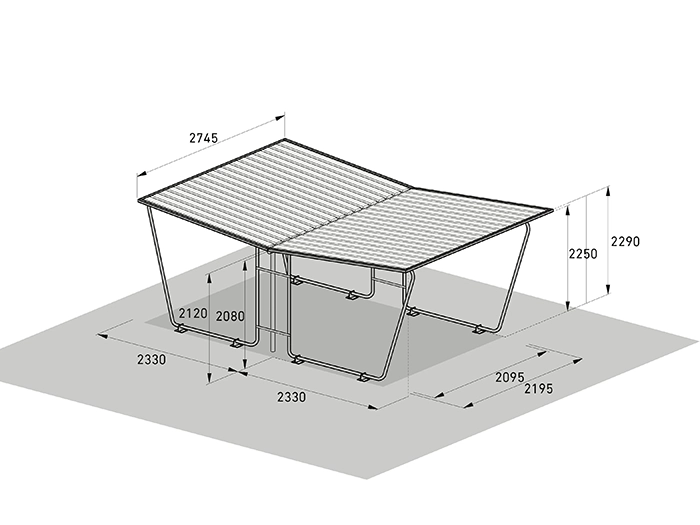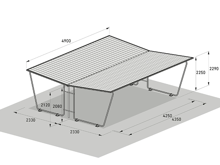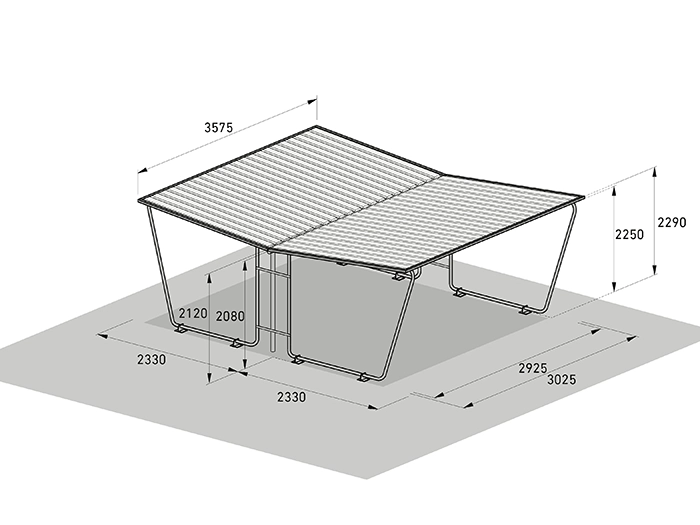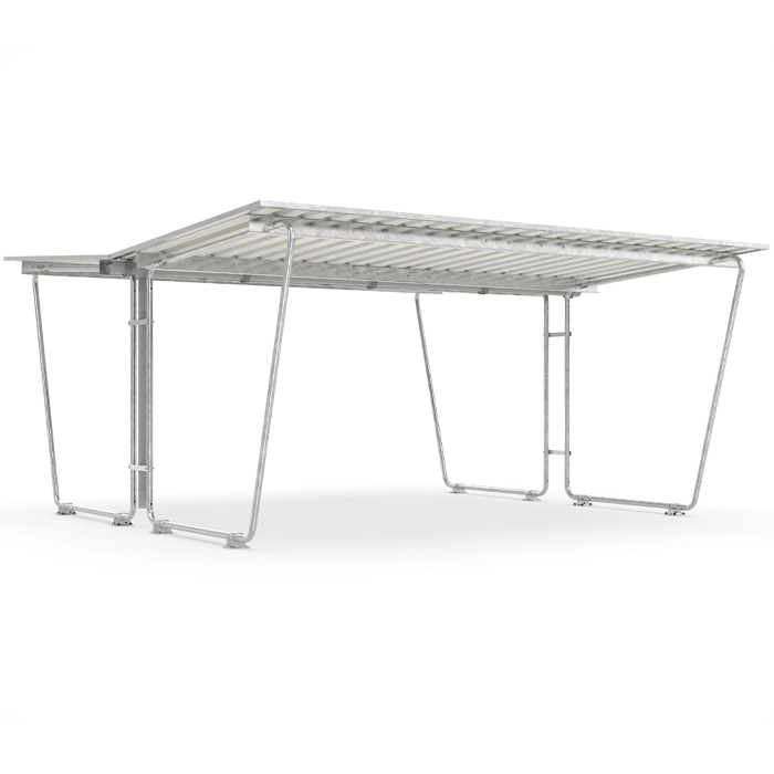 Siegen är ett standardiserat enkelpans-taksystem (enkelsänt tak) med väderbeständig trågplåt som takbeläggning. Konstruktionen består av en varmförzinkad stålrörsram som ger hög stabilitet och lång livslängd. Systemet finns i flera storlekar med valbara sidoväggar och tillbyggnader, så att du enkelt kan anpassa skyddet efter behov.