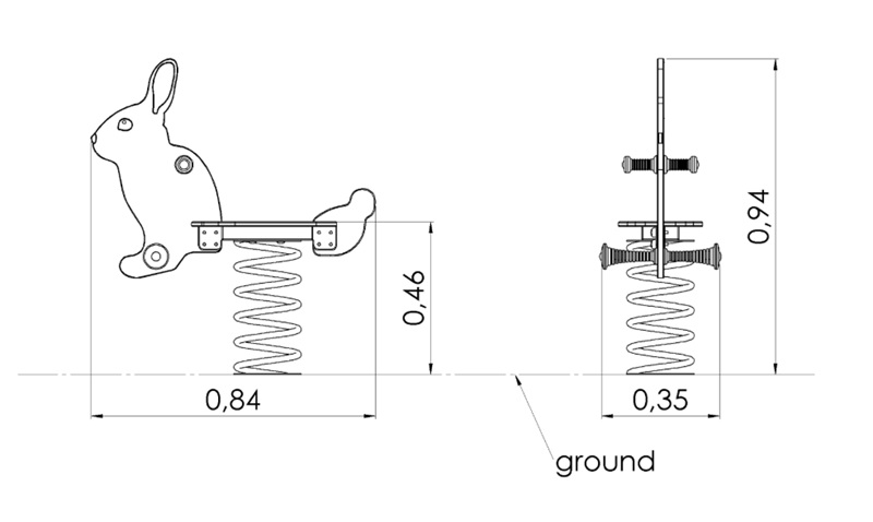 Fjädrarna är tillverkade av galvaniserat och pulverlackerat stål, den charmiga djurformen av 19 mm HDPE-plast, och markfästena av varmförzinkat stål, med standardlösning för nedgjutning i marken.