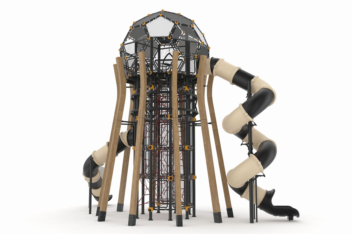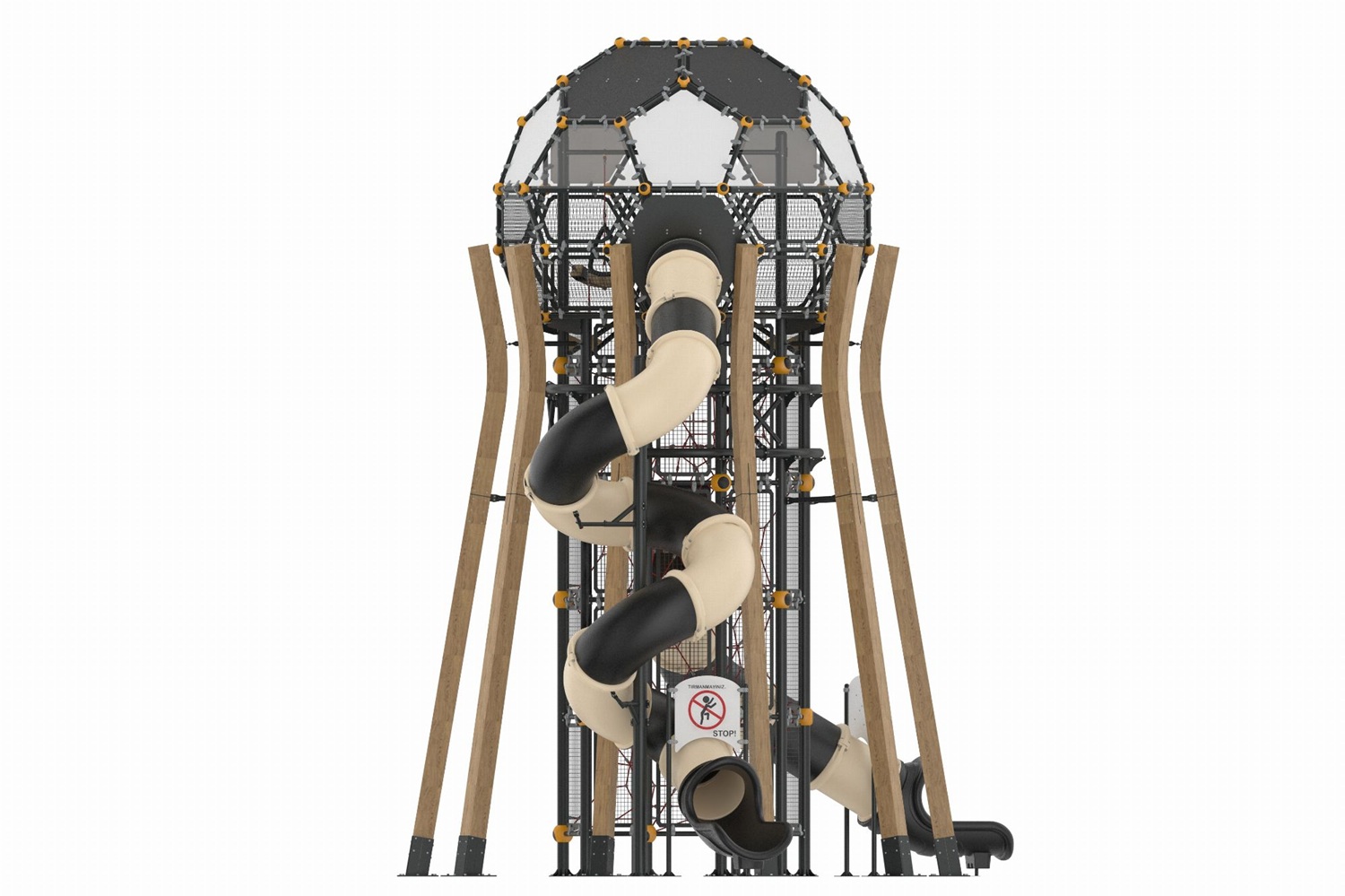 En utmanande klätterstig leder barnen hela vägen upp till toppen och är utformad för att utveckla deras motorik, balans och styrka, samtidigt som deras energi omvandlas till ren och vibrerande spelglädje. 💪🔥