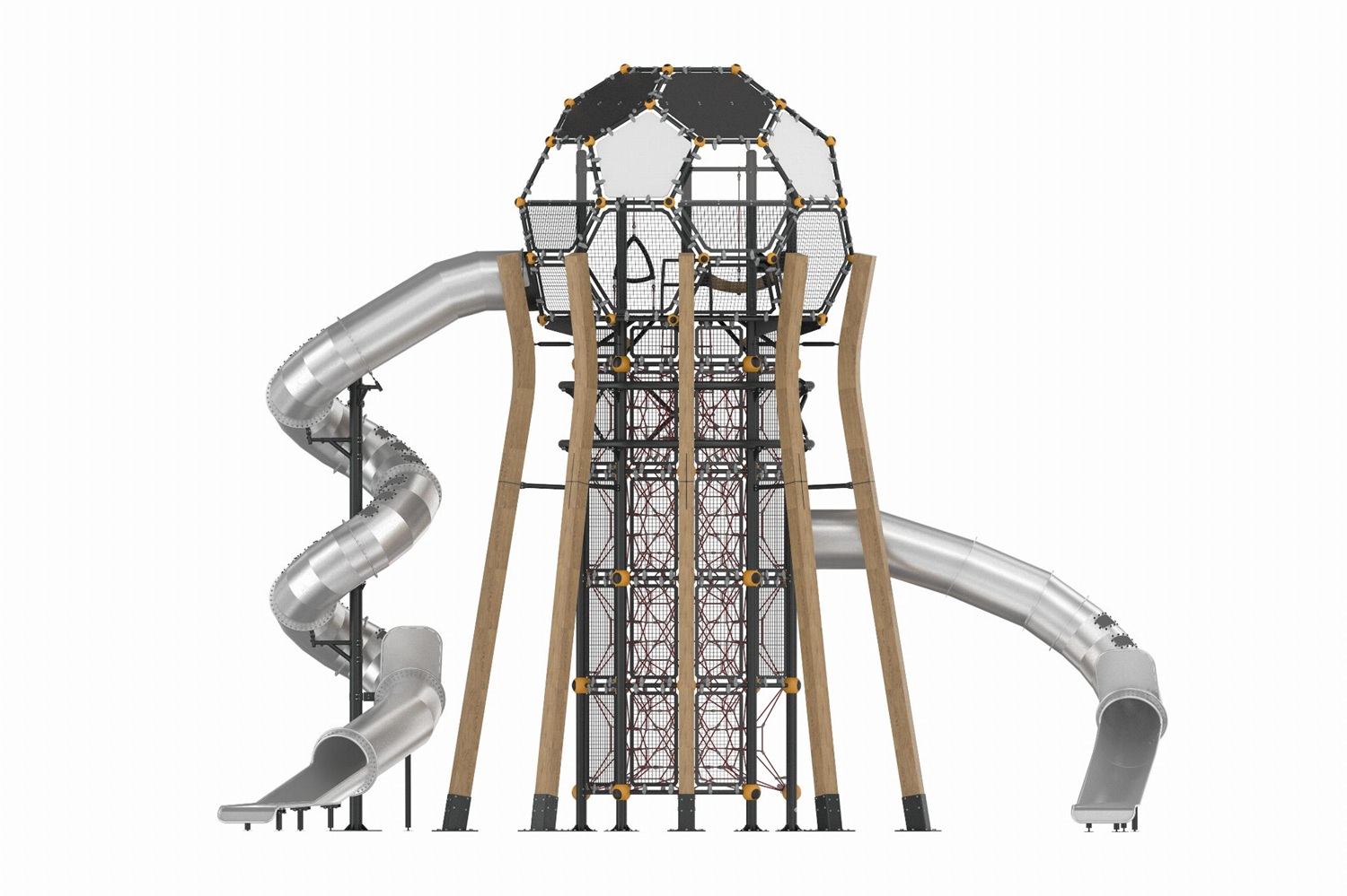 En utmanande klätterstig leder barnen hela vägen upp till toppen och är utformad för att utveckla deras motorik, balans och styrka, samtidigt som deras energi omvandlas till ren och vibrerande spelglädje. 💪🔥