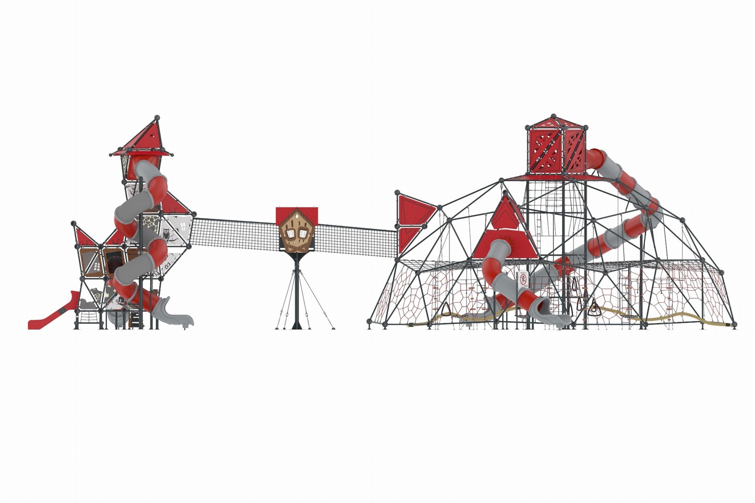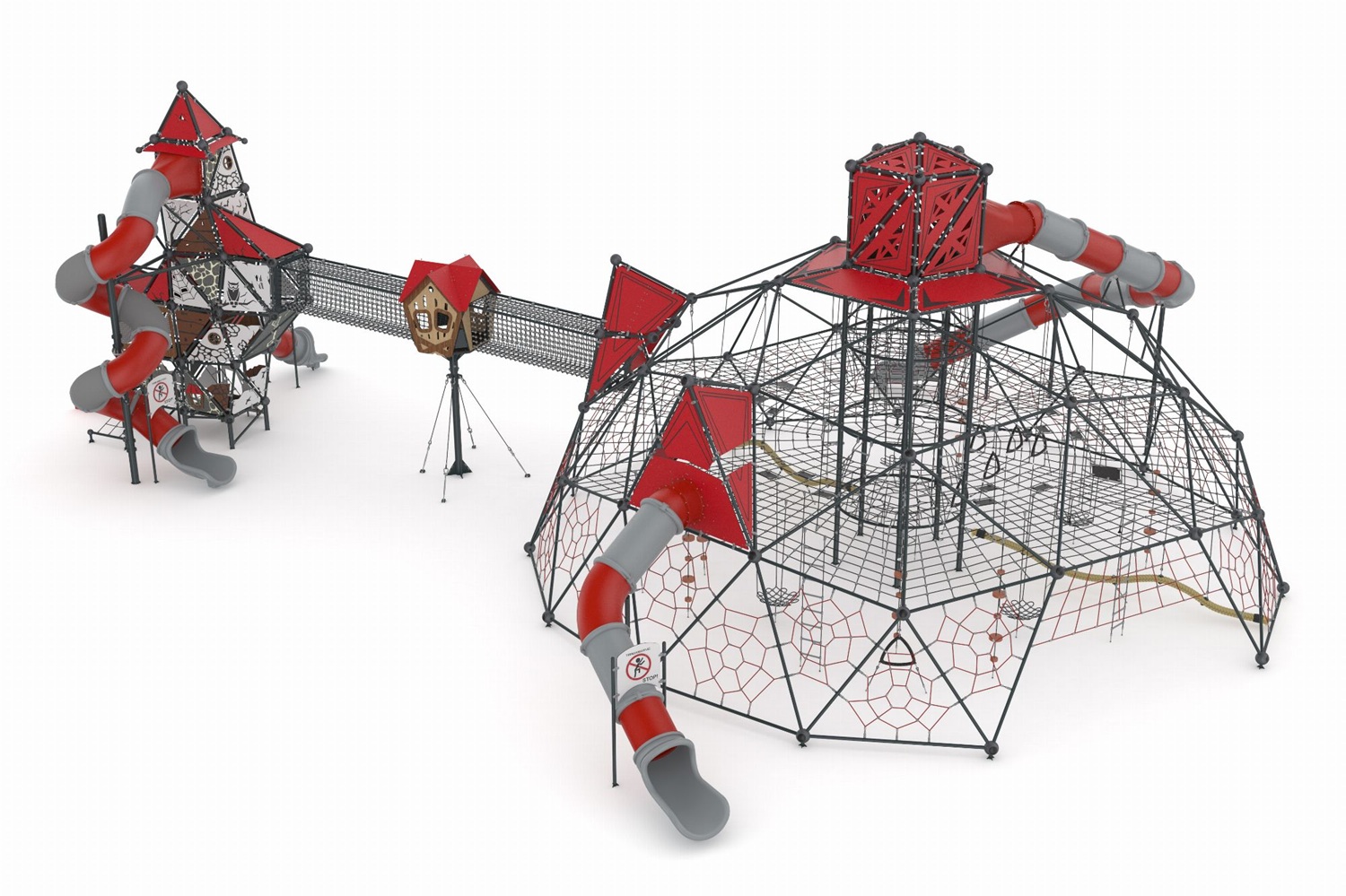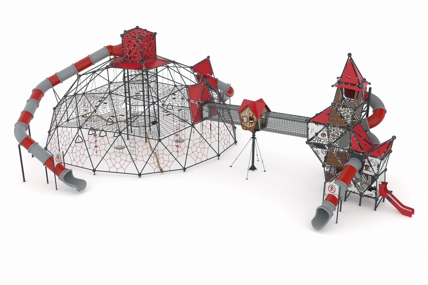 Tack vare den bro som förbinder de två byggnaderna kan barnen röra sig mellan världarna och uppleva maximalt med äventyr och rollek i detta stora, fantasifulla leklandskap. 🌈