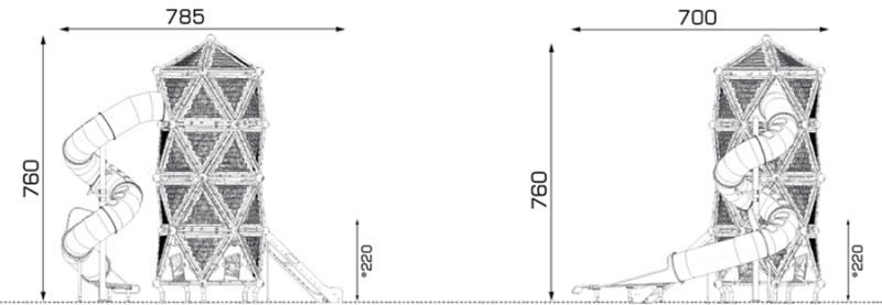 De sammanlänkade tornen, förbundna med en repbro, öppnar upp för oändligt många lek- och äventyrsscenarier – där barn kan utforska, klättra och låta fantasin ta dem ännu längre ut i galaxen. 🌠