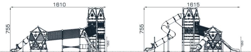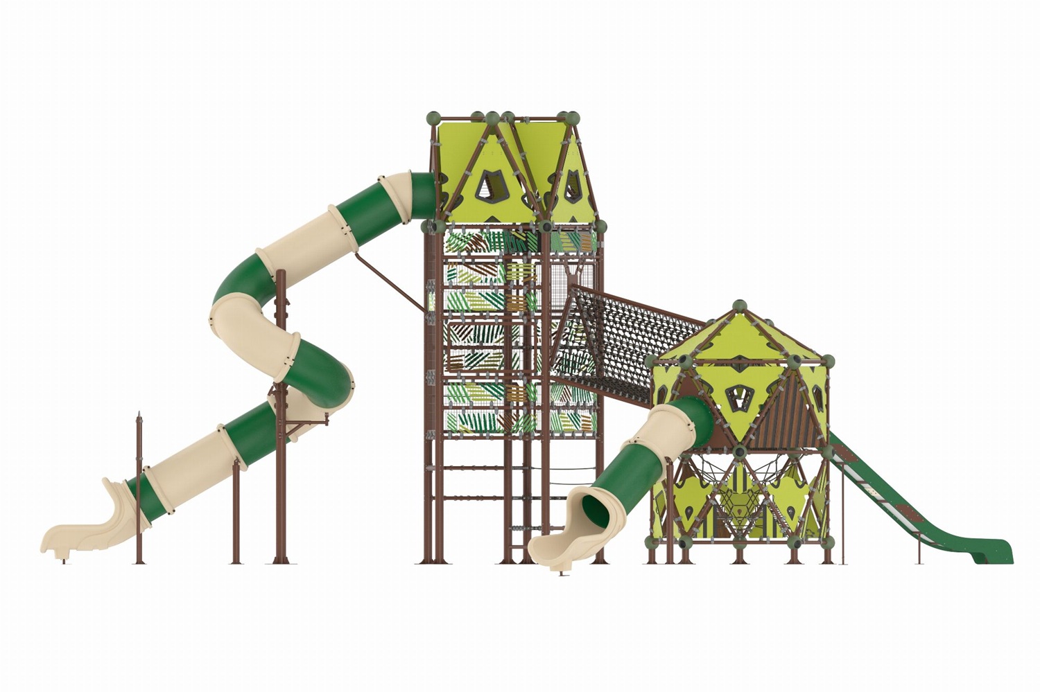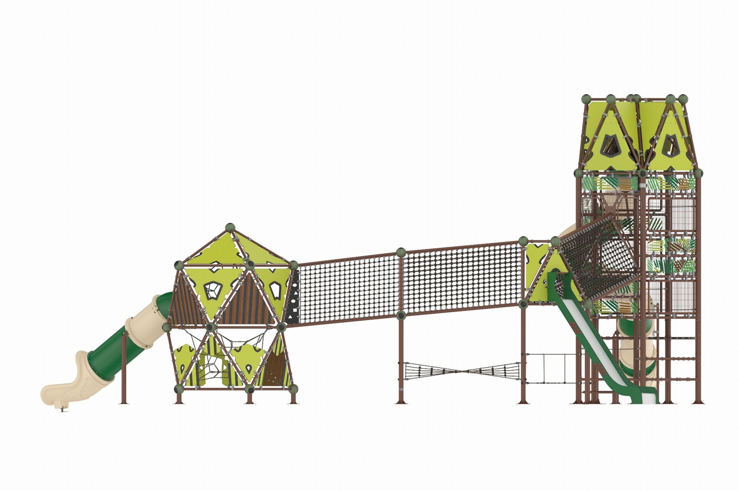 Lekutrustningen bestĂ„r av repbroar, klĂ€ttringselement och kromade rutschkanor i varierande höjder â allt utformat för att ge barn 5 Ă„r och uppĂ„t kĂ€nslan av att utforska naturen pĂ„ riktigt.