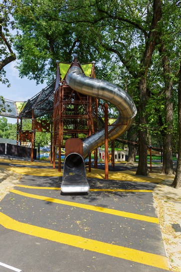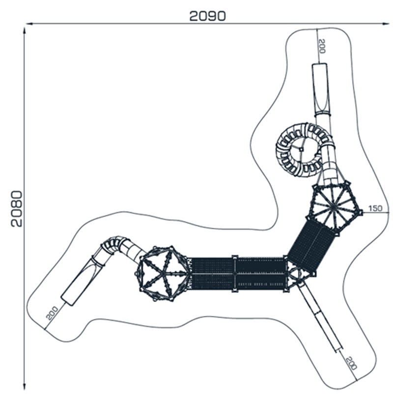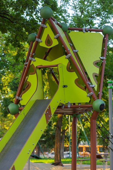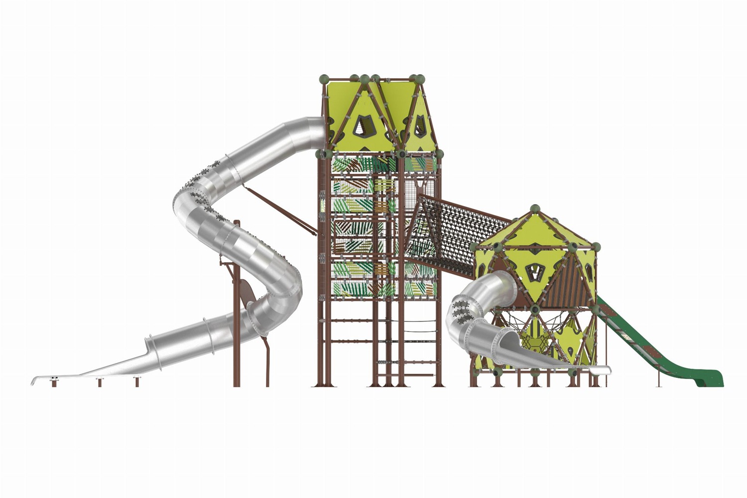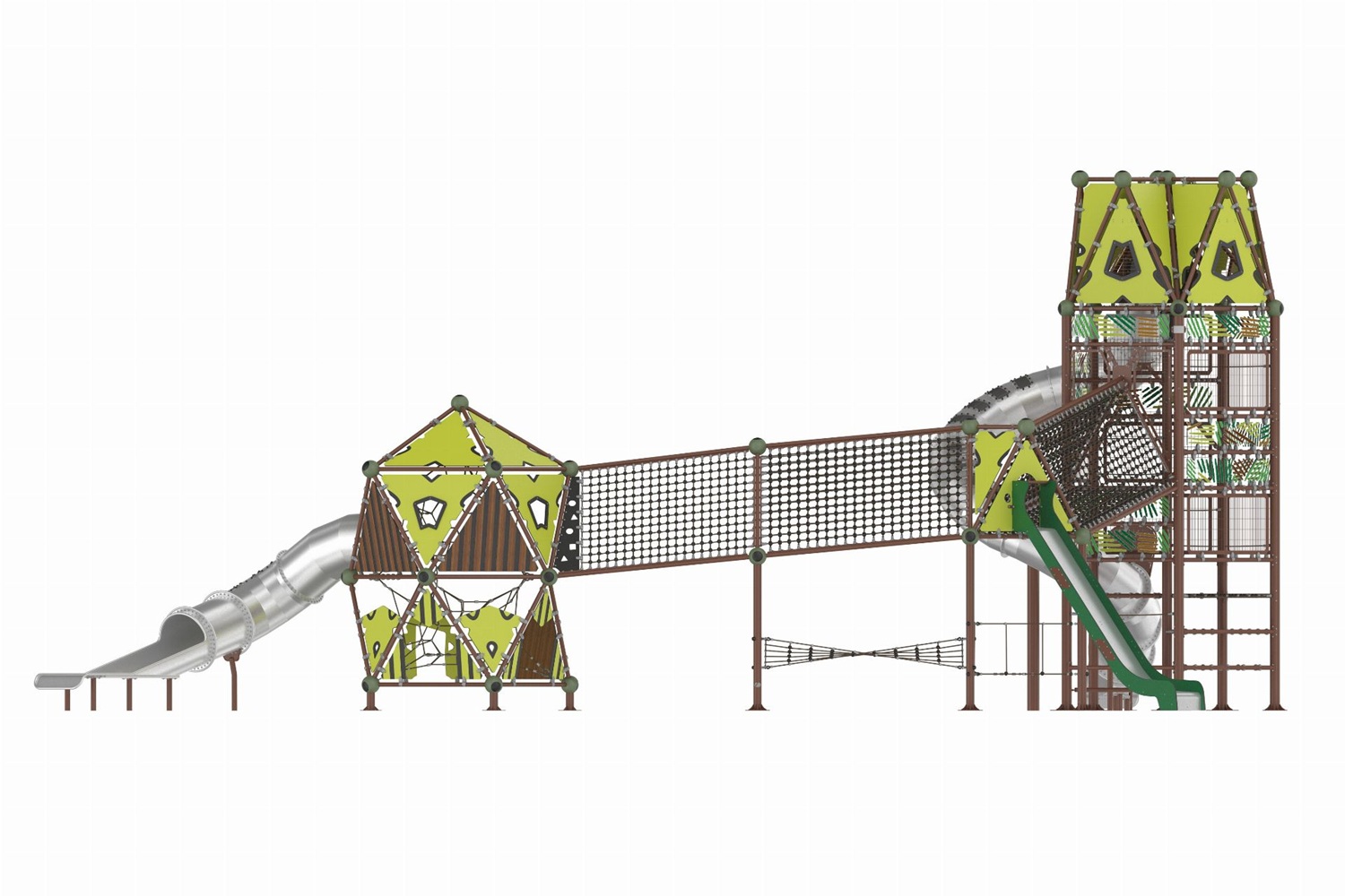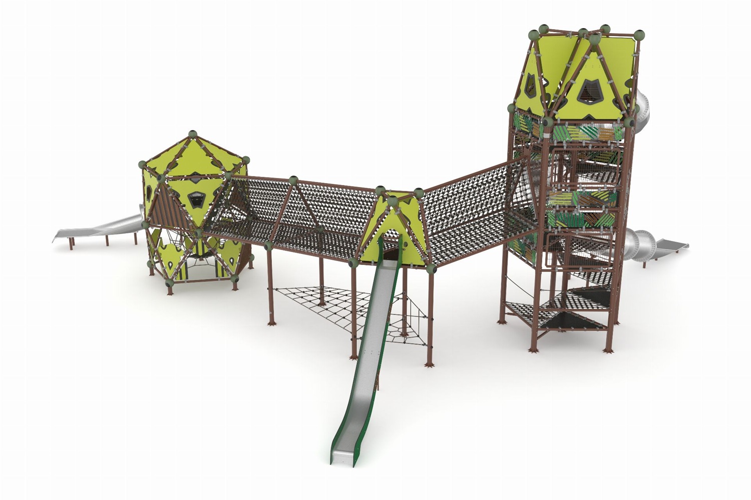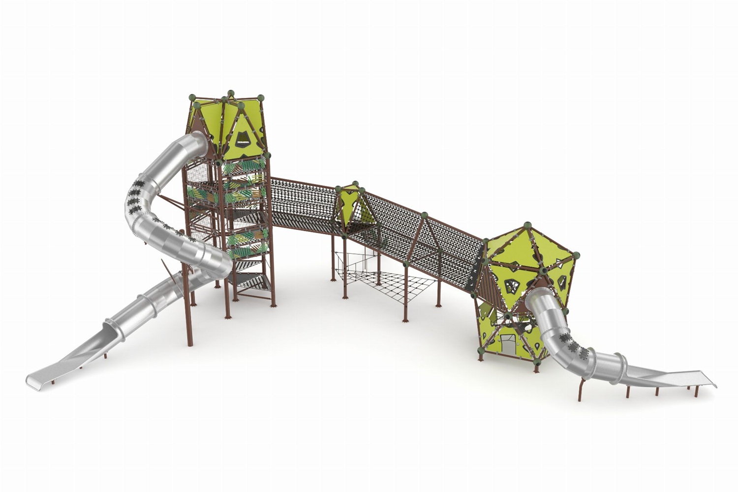 Lekutrustningen bestĂ„r av repbroar, klĂ€ttringselement och kromade rutschkanor i varierande höjder â allt utformat för att ge barn 5 Ă„r och uppĂ„t kĂ€nslan av att utforska naturen pĂ„ riktigt.