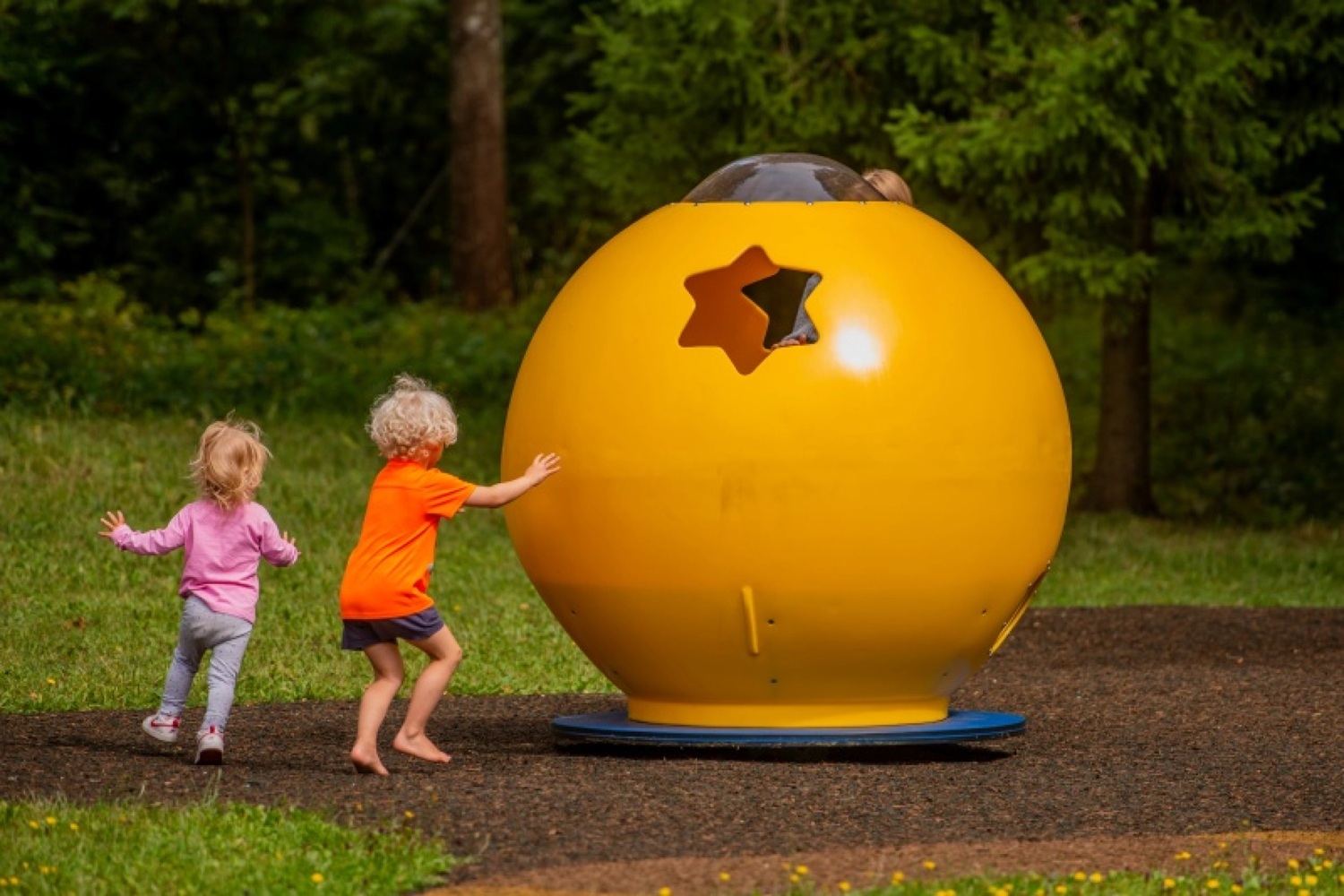 Karusellen PLUTO bjuder på ett virvlande äventyr för upp till fyra barn åt gången. Med glimten i ögat kan små upptäcktsresande titta mot himlen genom det runda takfönstret och kika ut genom två stjärnformade fönster. ✨