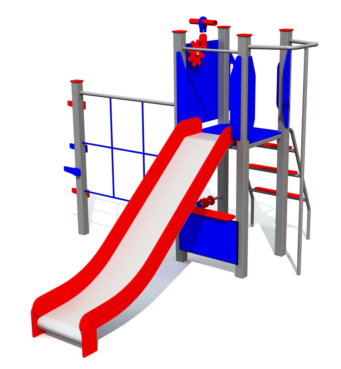 PR100 är en högre lekställning lämplig för de lite äldre barnen. Barnen tar sig till plattformen genom en steg-trappa som utmanar barnen i klättring. Uppe på plattformen möts de av "skeppets" ratt samt kikare. Härifrån kan barnen antingen glida ner på brandmannastången eller rutschen. Lekställningen utmanar också barnen att klättra, antingen i nätet eller upp via klätterstegen. Sist men inte minst så öppnar klätterställningen upp för olika rolllekar under plattformen.