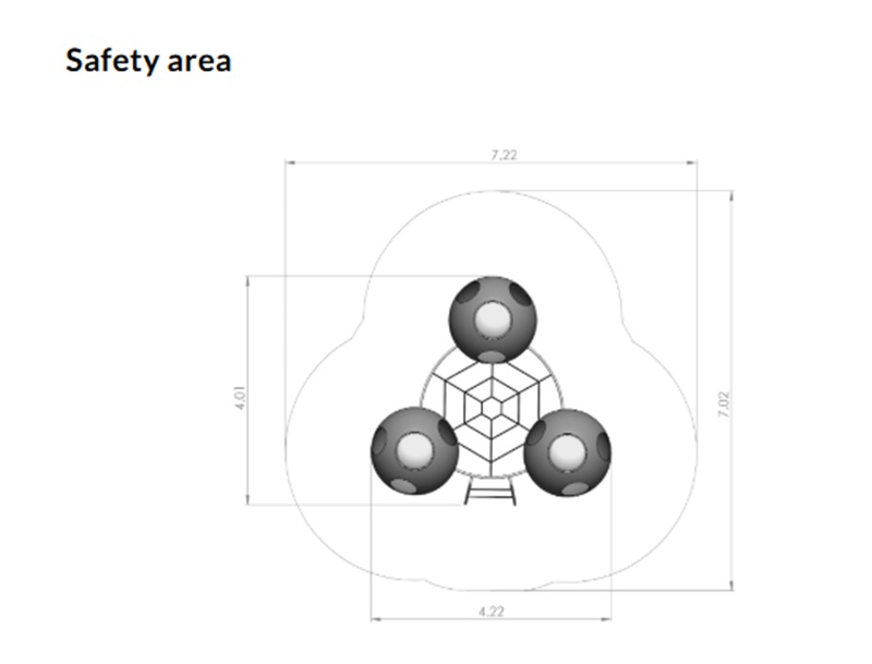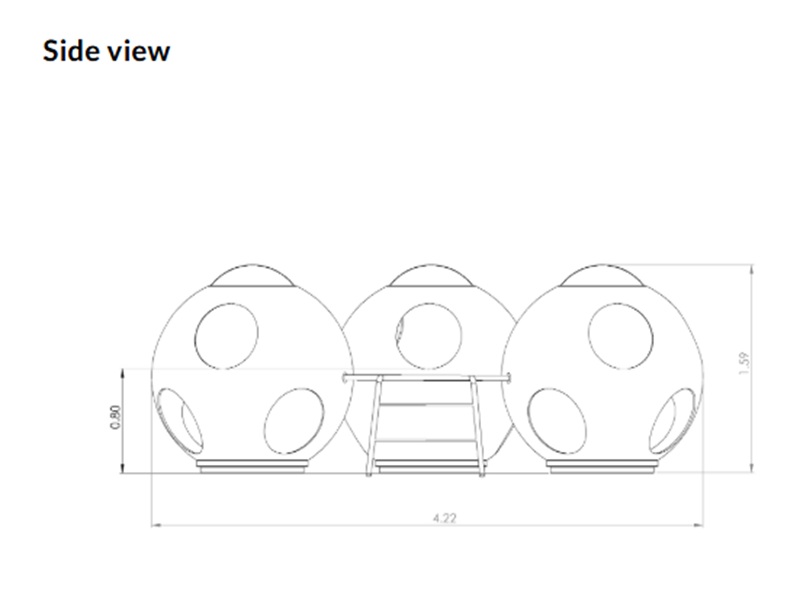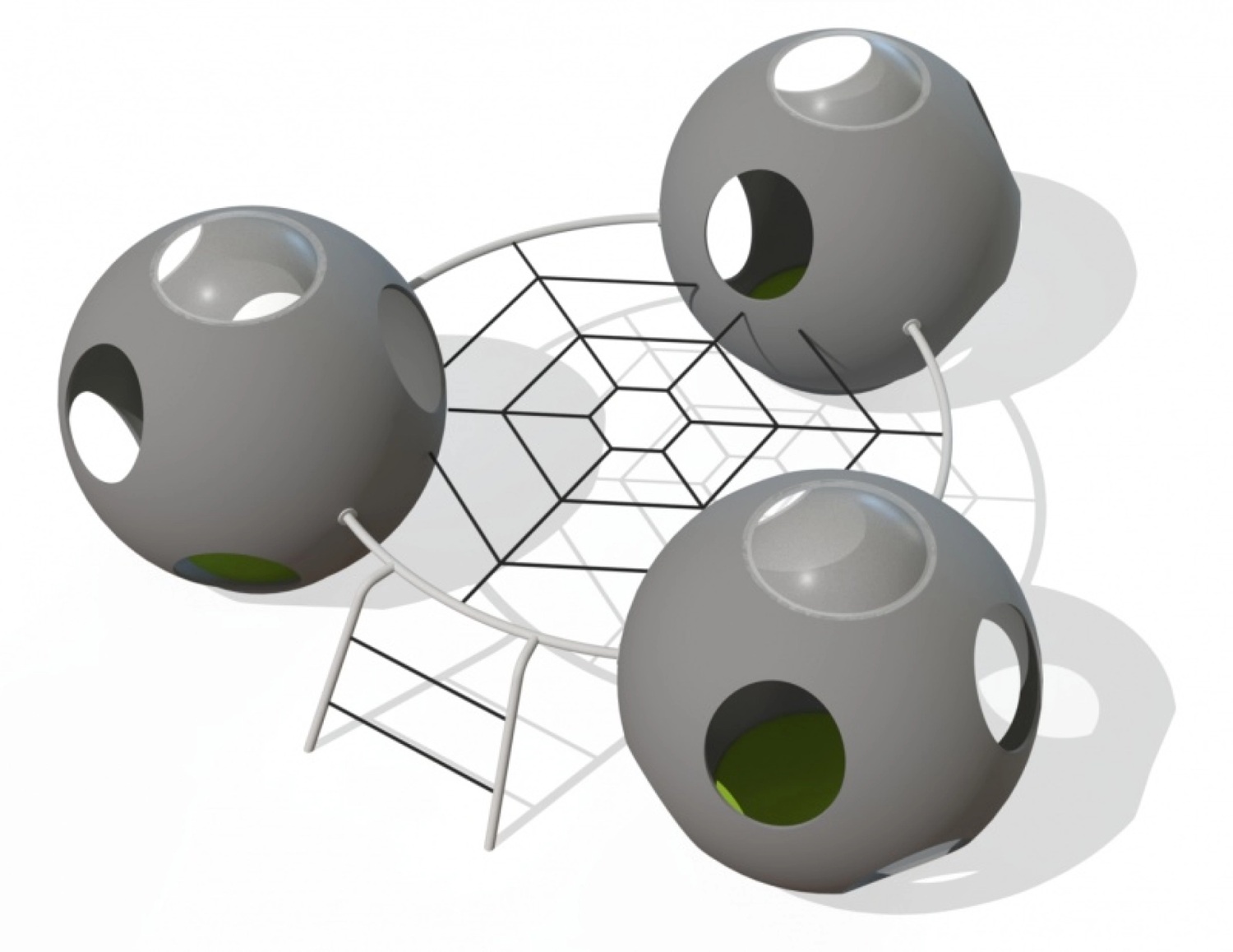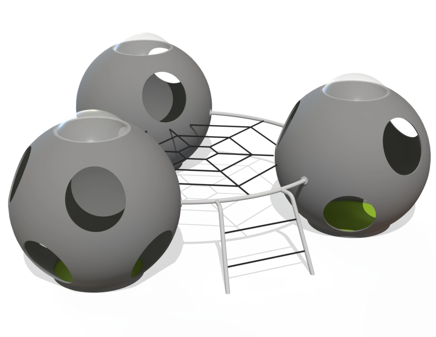 Tre stora, kupolformade sfärer med fantasifullt utformade öppningar är sammanlänkade med ett klätternät och en stege – perfekt för klättring, rörelse och kurragömma. 🌟