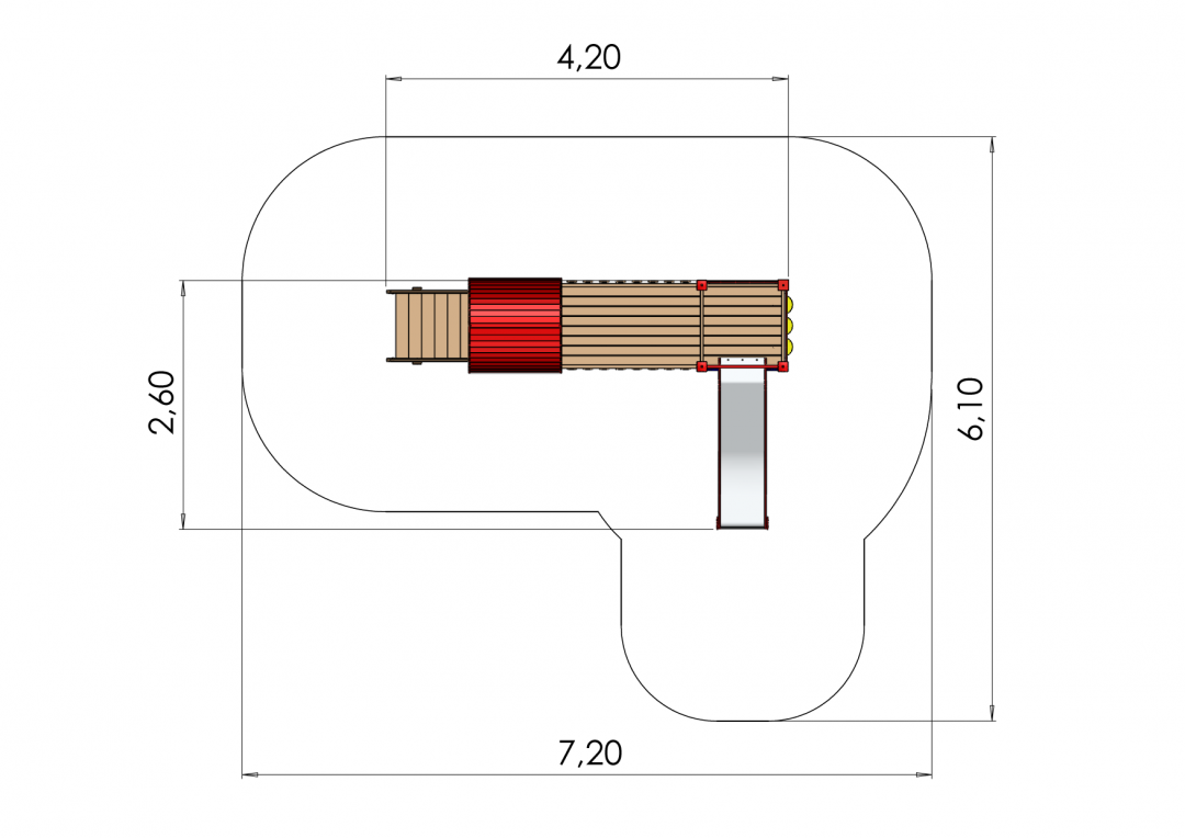 LAURA lekställning med rutschens höjd på 0,95 m. Lekställningen har en lång bro för barnen att utforska, ett tak och ett luffarschackspel.