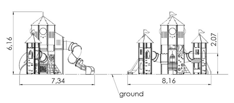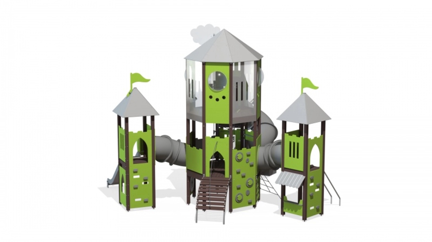 Slottet har fyra plattformar i olika höjder, sammanbundna med krypgångar, och den högsta nivån nås genom att klättra i en repgång – perfekt för små äventyrare med stora drömmar. ✨