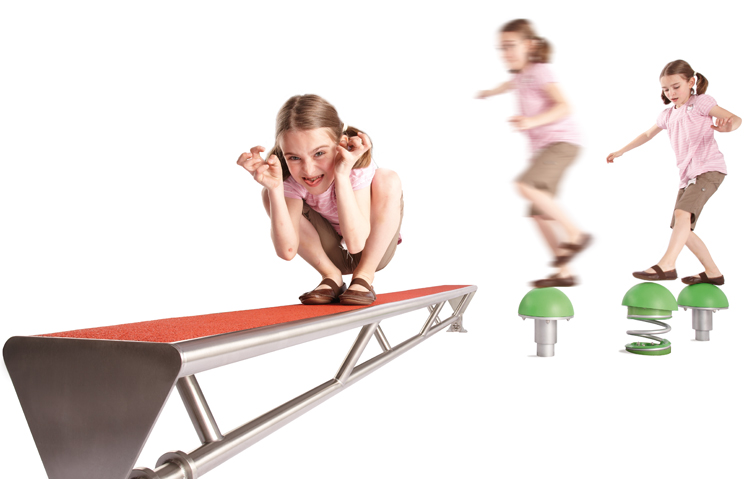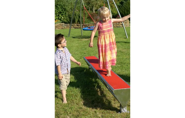 A teetering beam is a challenge for all balancing artists: One could hardly have more fun training their sense of balance. Spring-loaded swivel joints facilitate the teetering effect. To ensure that no one slips on their way across the shaky balance beam, the beam is coated with a layer of colored rubber granulate.