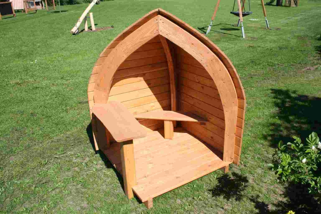 Lillifix lekstuga i obehandlat lärkträ. 1 x 1 m. Inkl. bord och bänk med fast golv.