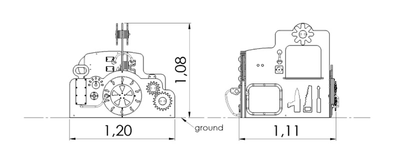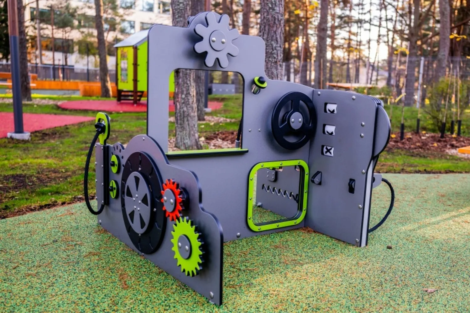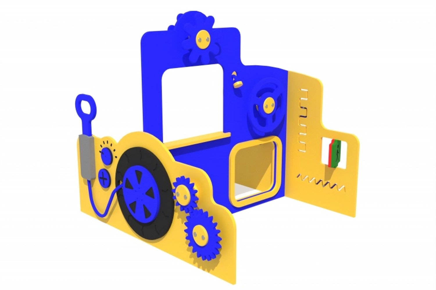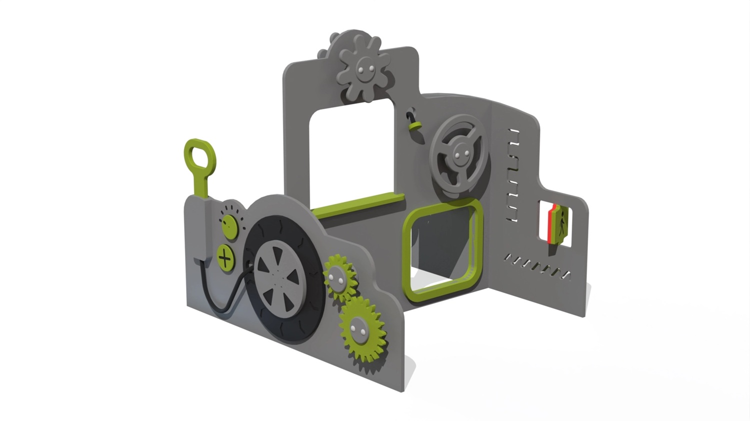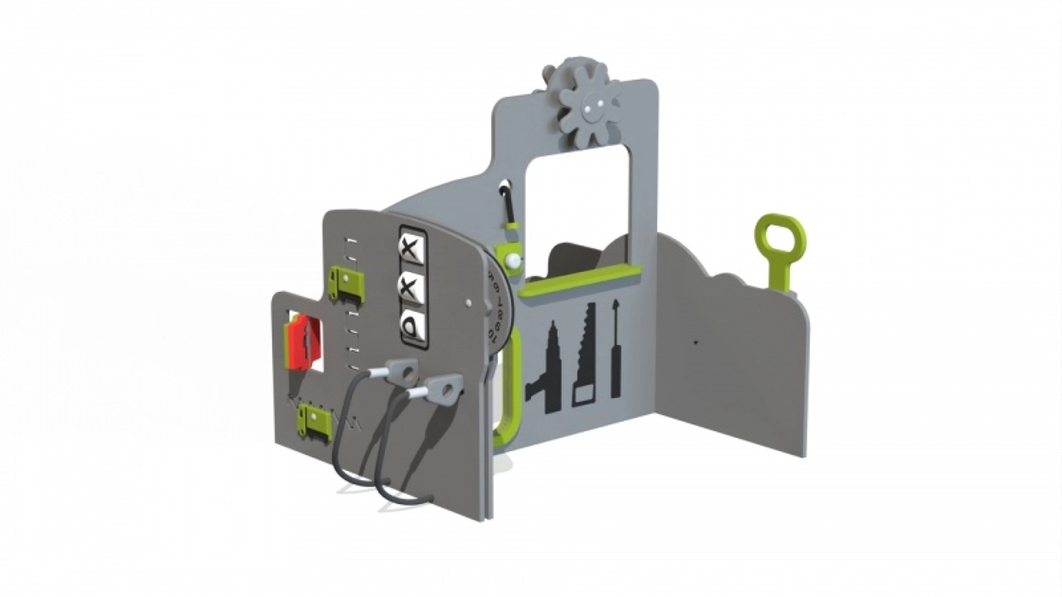 🔹 2 räfflade vred för att leka med bilar, 1 ringklocka, samt en panel med verktygsmotiv. 🔩