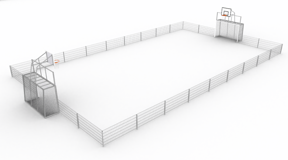 Arenan inkluderar materialet varmgalvaniserade stolpar, 2D-svetsade 8/6/8 staketpaneler med fästen, 2 st 3 x 2m fotbollsmål med polypropen fotbollsmålnät, nät 45mm, rep 3mm. 2 x basketkonstruktioner med tavlor (1,2x0,9) med styva ringar och nät. Ingång till arenan från sidorna av fotbollsmål.