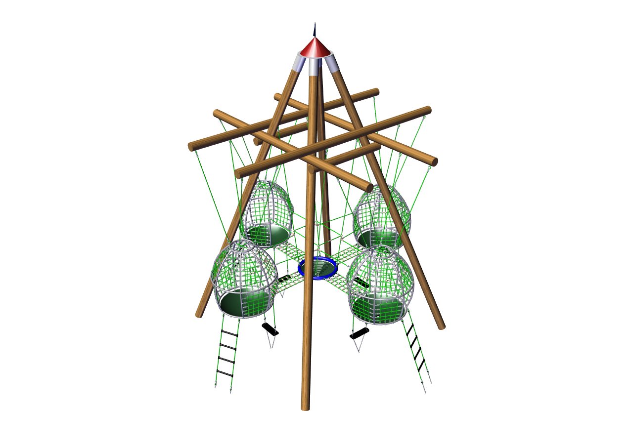 Klätterställning med 4 korgar i form av oliver samt klätterstegar, gungor under korgarna och fågelbo i mitten som man kan krypa ut till på via små nätgångar.