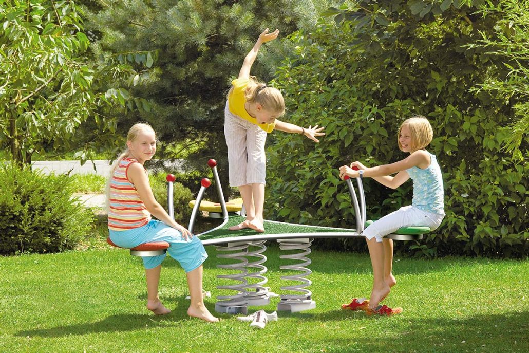 Sometimes one is lucky enough to see more than just one butterfly in the meadow. And sometimes one can even play with three butterflies and plenty of friends. Three flower-seats made of high-quality rubber granulate resemble butterflies thanks to the stainless steel feelers that serve as handles, inviting children to play, sway or relax in the large space in the middle.