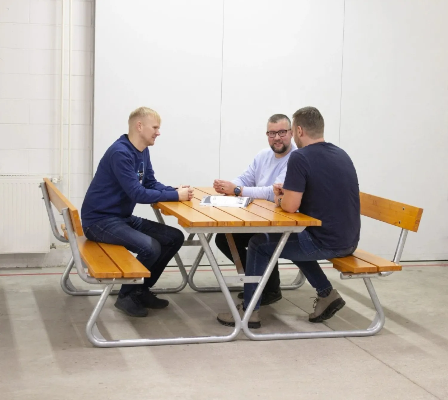 Konstruktionen är tillverkad av varmförzinkat stål för hög hållfasthet, och bordsskivorna av väderbeständigt laminerat trä som ger lång livslängd och naturlig känsla.