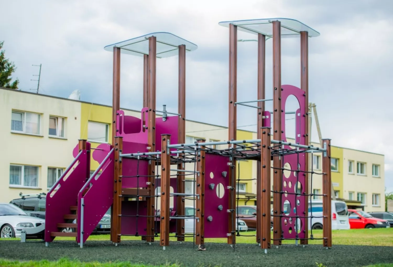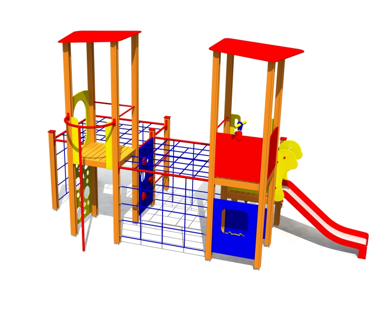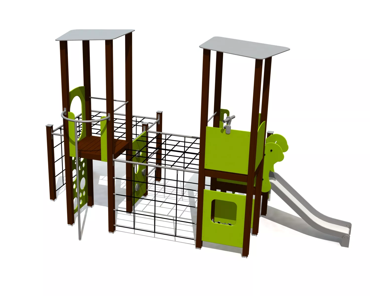 Felicia är en tjusig klätterställning med två torn, rutsch och klätterboxar mellan tornen.