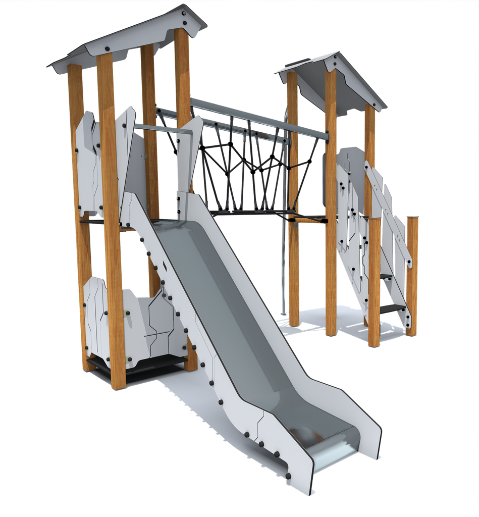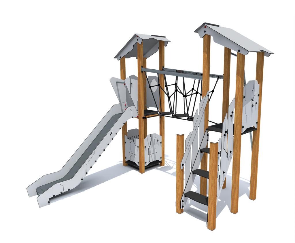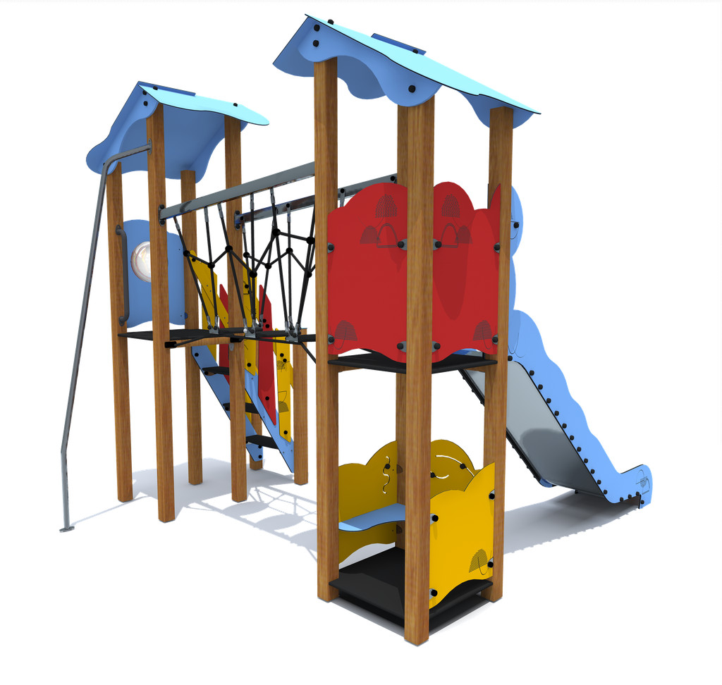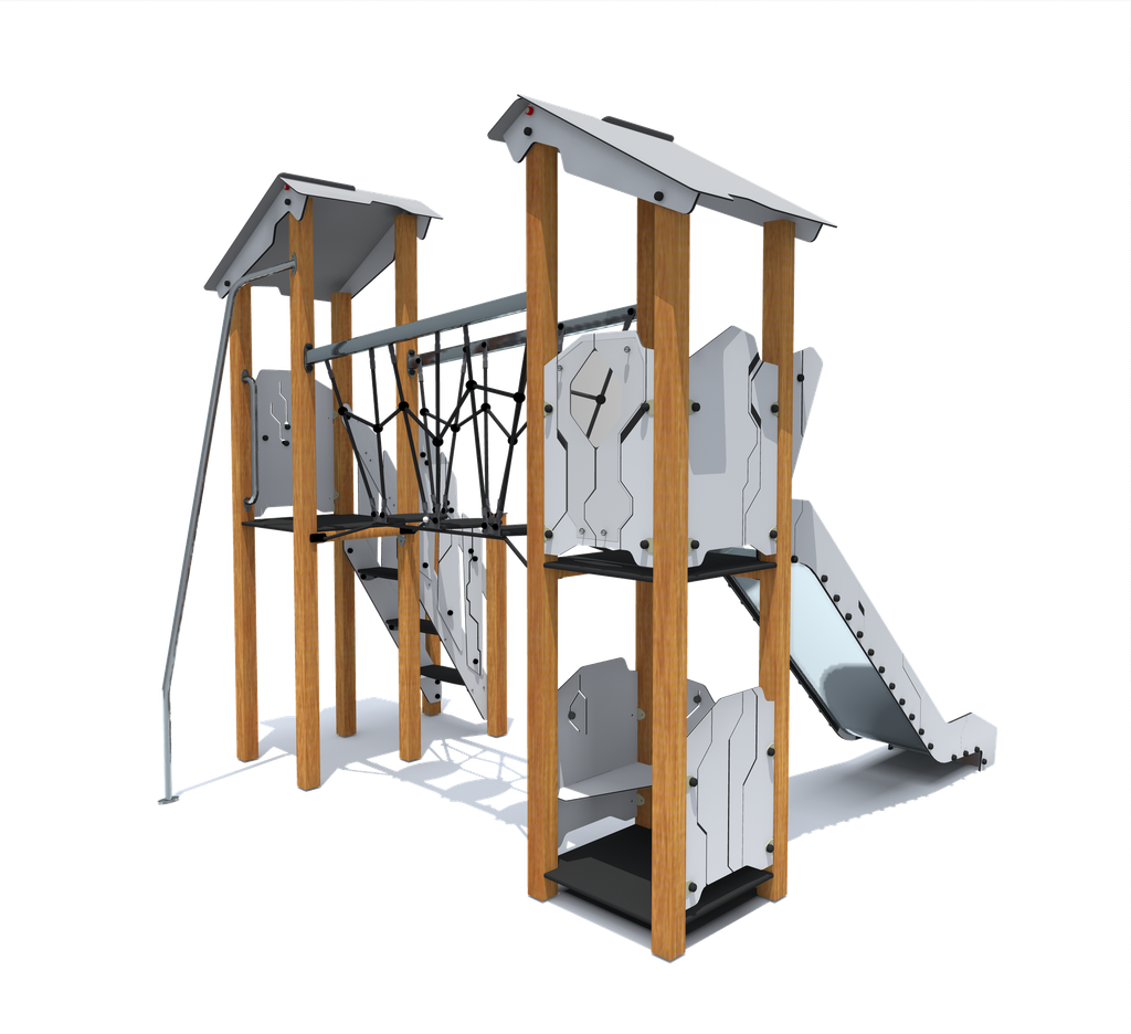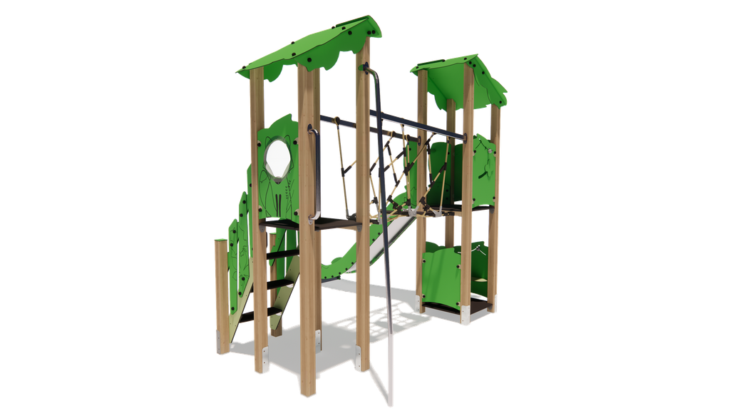 En klassisk beprövad lekställning med två högre plattformar som sammanlänkas med en äventyrlig bro. Lekhörna i marknivå för de yngsta barnen, skyddande tak, fönster och utmanande brandmannastång eller rutsch för nedfärd.