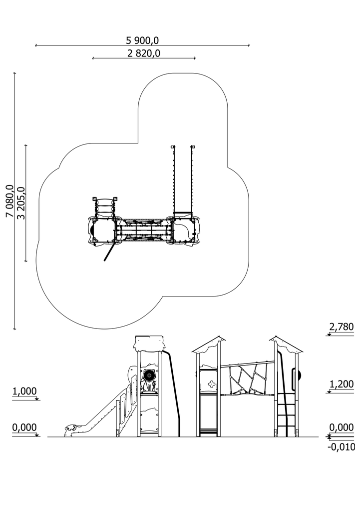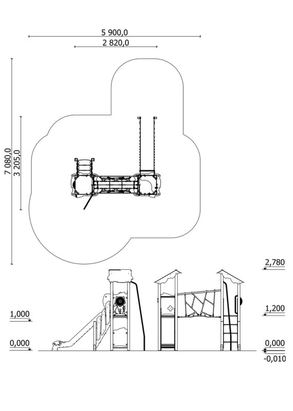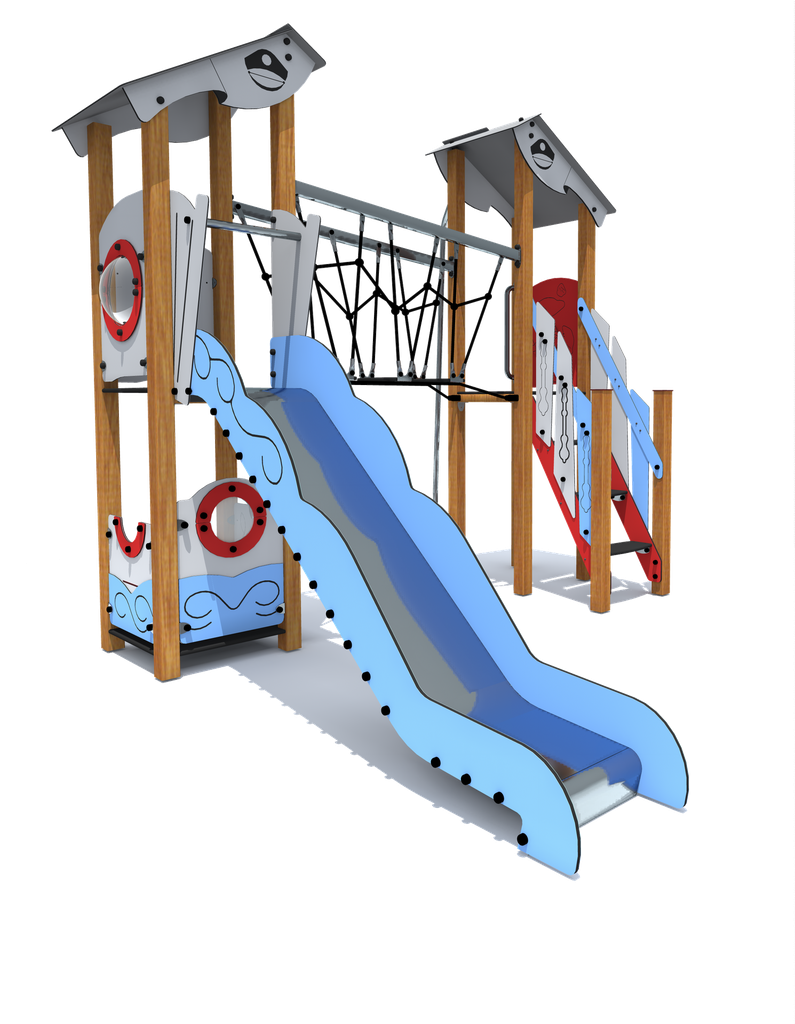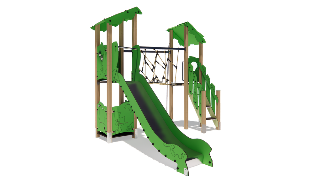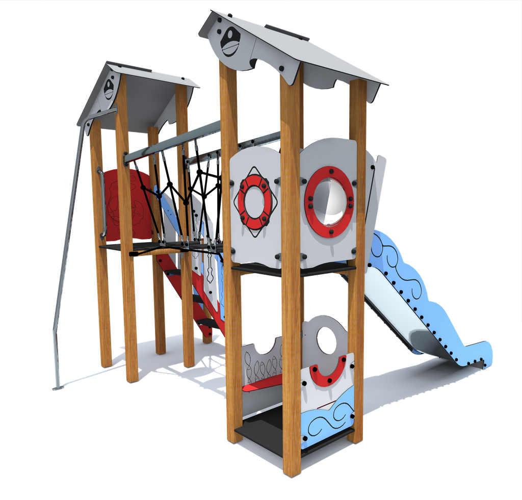 En klassisk beprövad lekställning med två högre plattformar som sammanlänkas med en äventyrlig bro. Lekhörna i marknivå för de yngsta barnen, skyddande tak, fönster och utmanande brandmannastång eller rutsch för nedfärd.