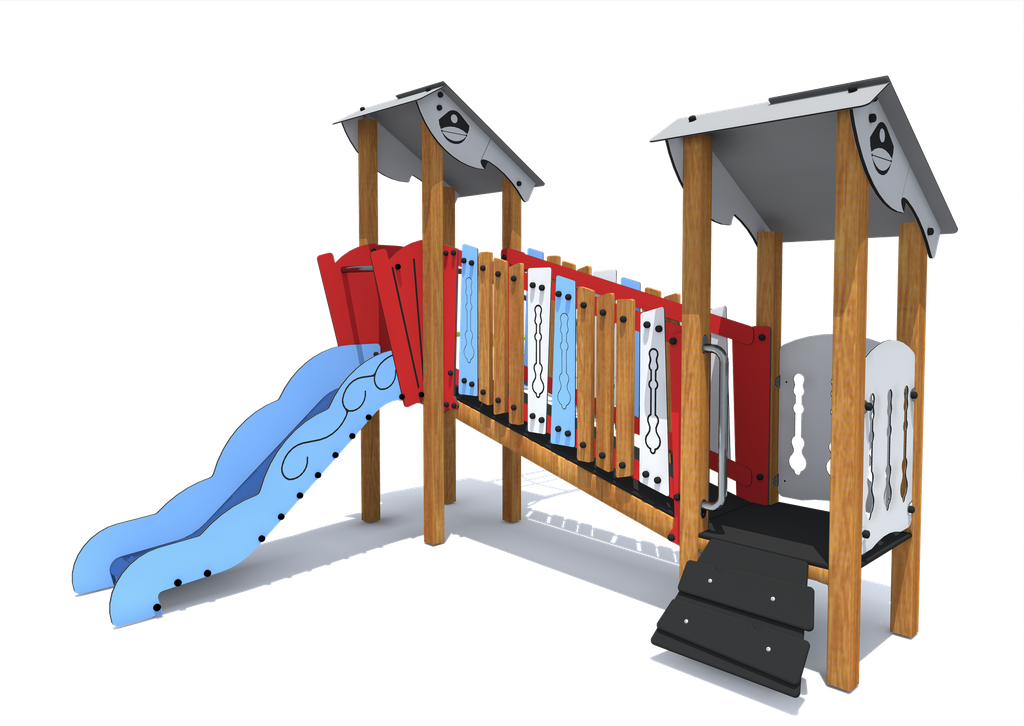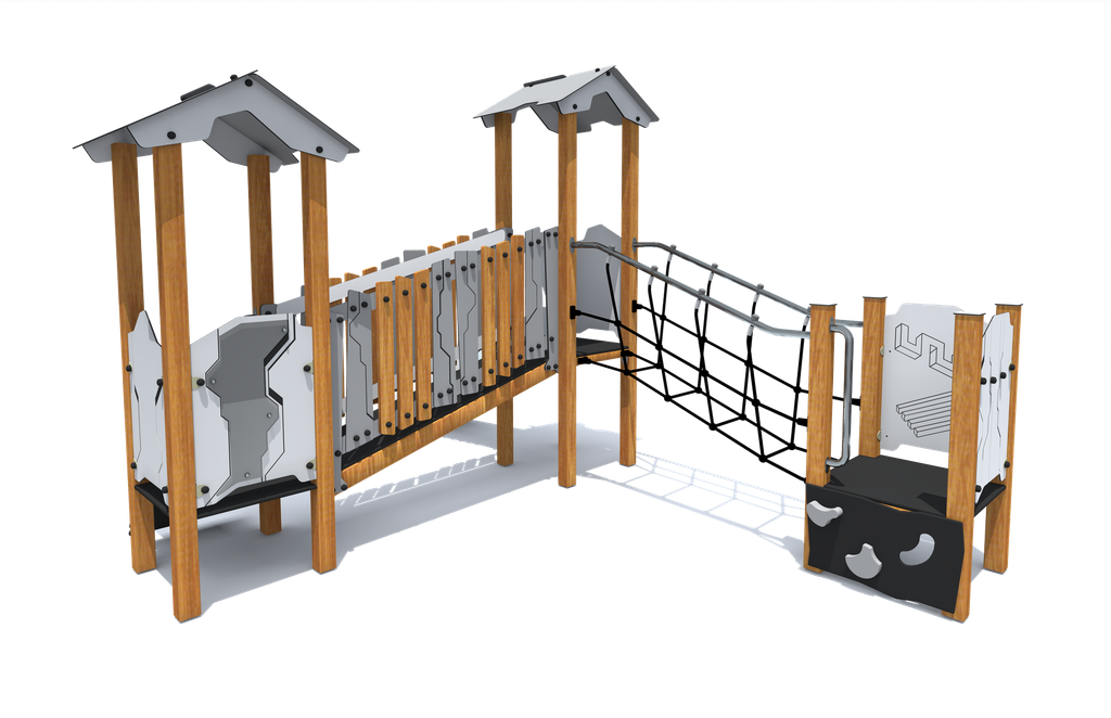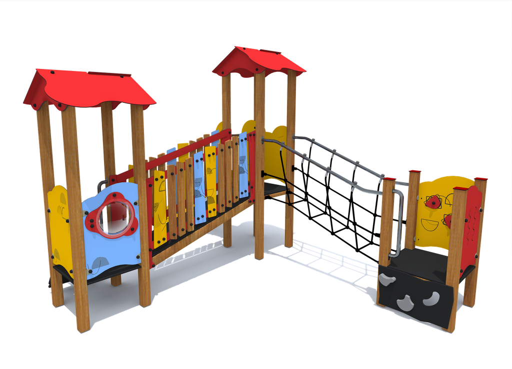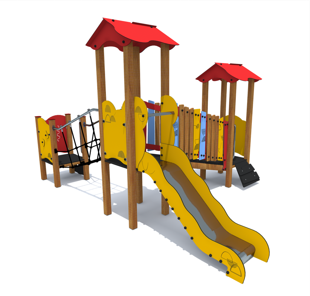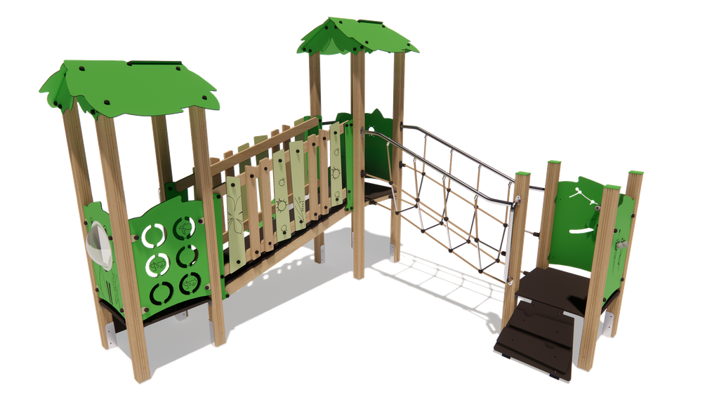 Lekställningen består av tre separat plattformar vilka sammanlänkas via broar. Lekfulla paneler och tak som ger skydd från både regn och den starka solen.