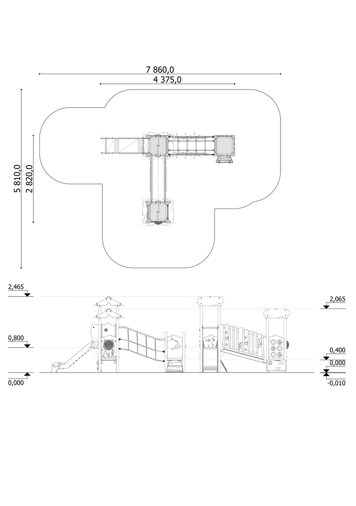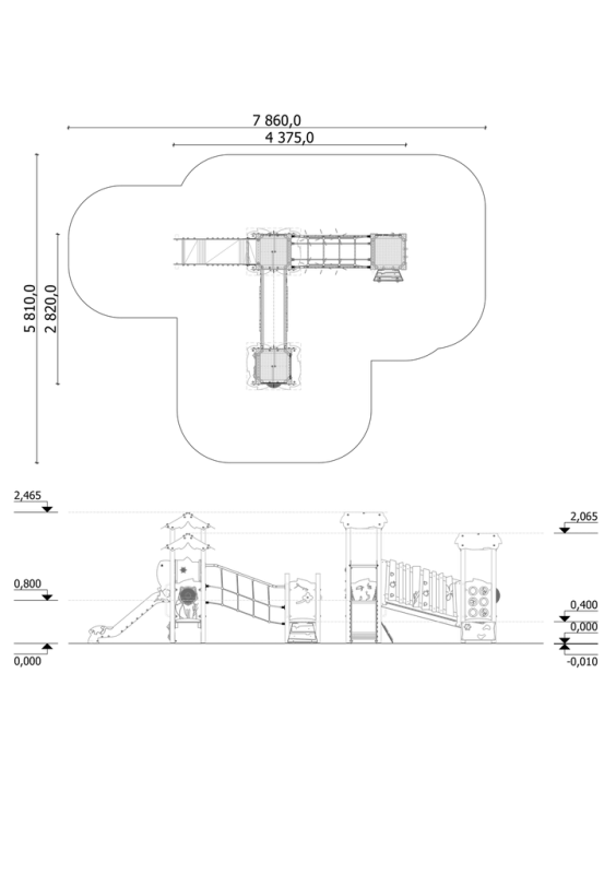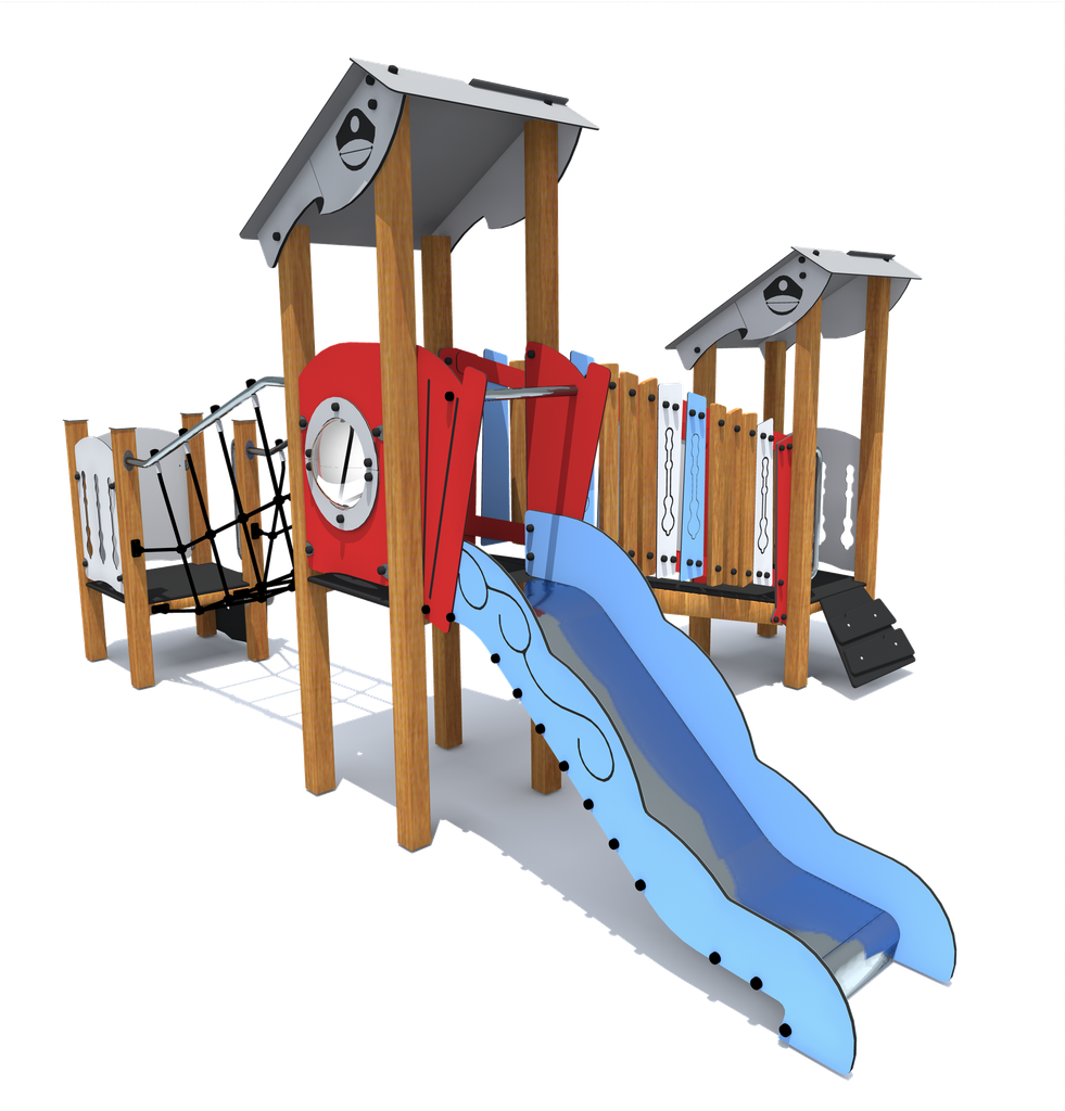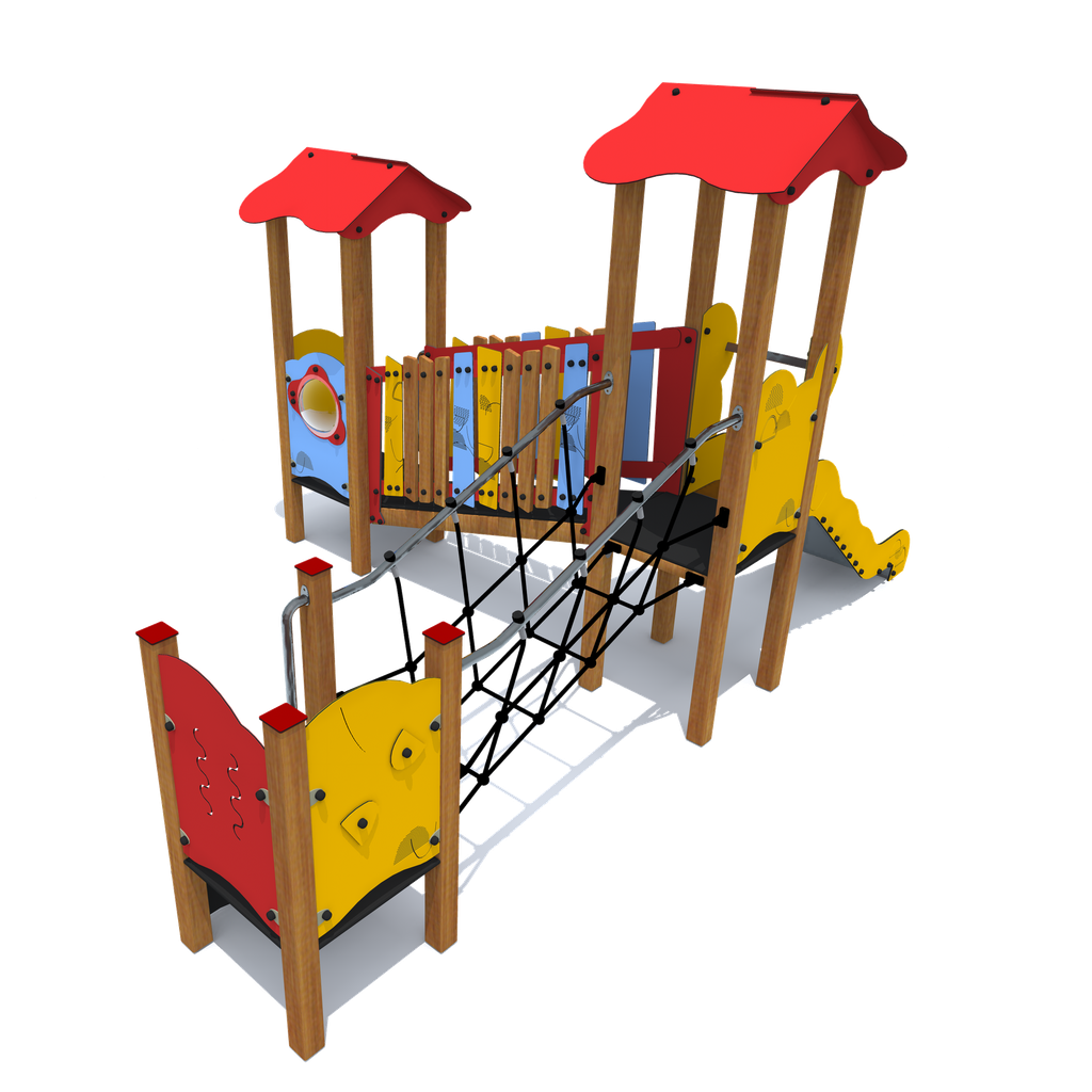 Lekställningen består av tre separat plattformar vilka sammanlänkas via broar. Lekfulla paneler och tak som ger skydd från både regn och den starka solen.
