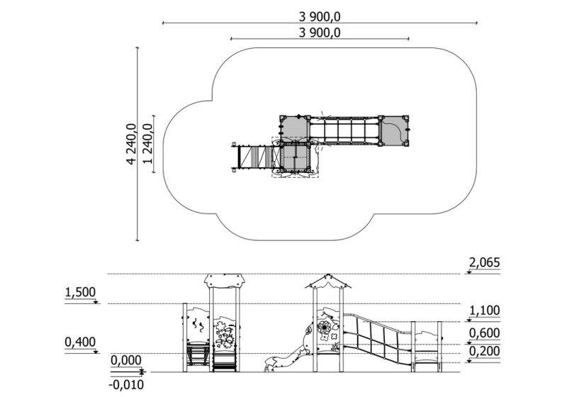 Tjusig lekställning för de små barnen att successivt växa upp och utveckla sig med. Barnen erbjuds tre plattformar med läckra paneler och skyddande tak samt en äventyrlig repbro.