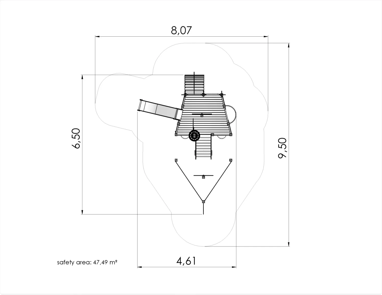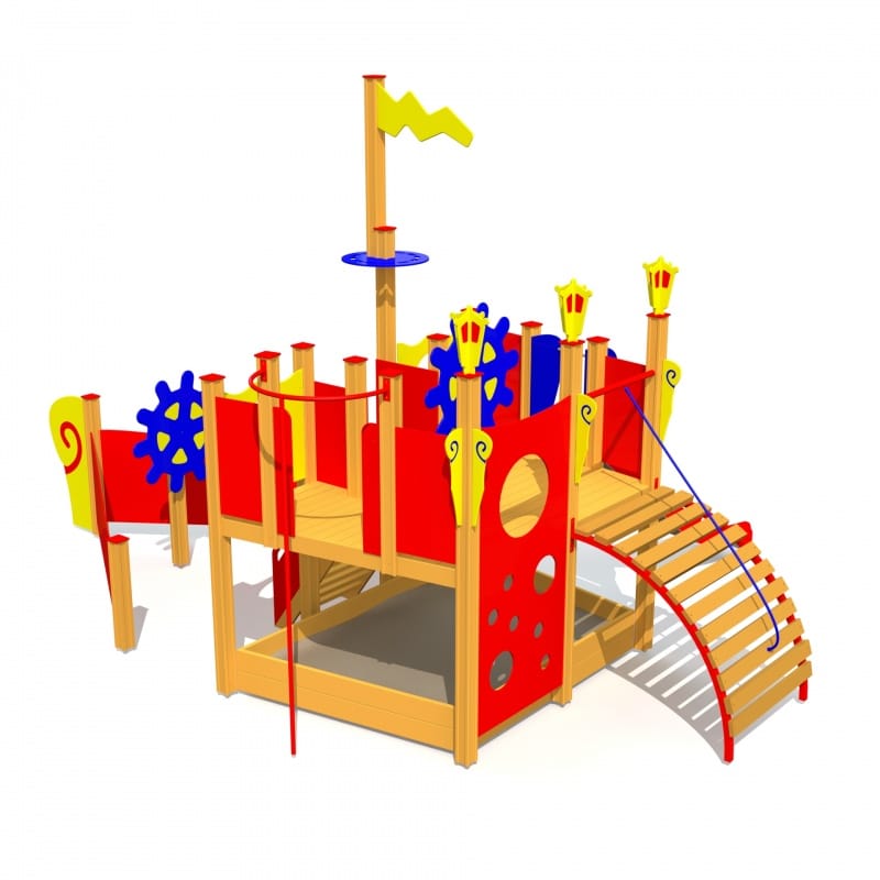 Detta härliga skepp är lämpligt för de yngre barnen barn. Fartyget har en stor plattform med höjden 1,2 m. Från plattformen styr man skeppet med ratten och det finns en rutschkana för vidare äventyr. Under plattformen finns småbarnsleken i form av en sandlåda.