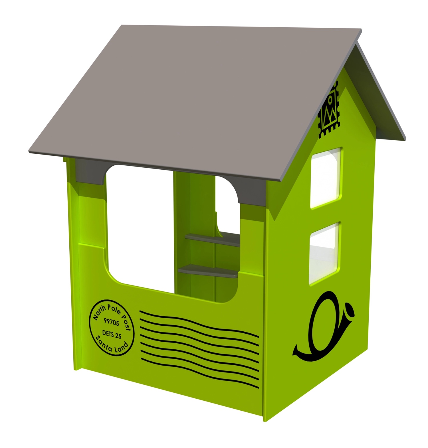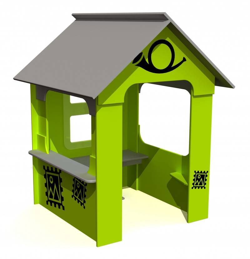Ett charmigt lekhus i form av ett postkontor med bänk och lekbord – perfekt för små brevbärare som vill sortera post, dela ut brev och leka tillsammans. 💌