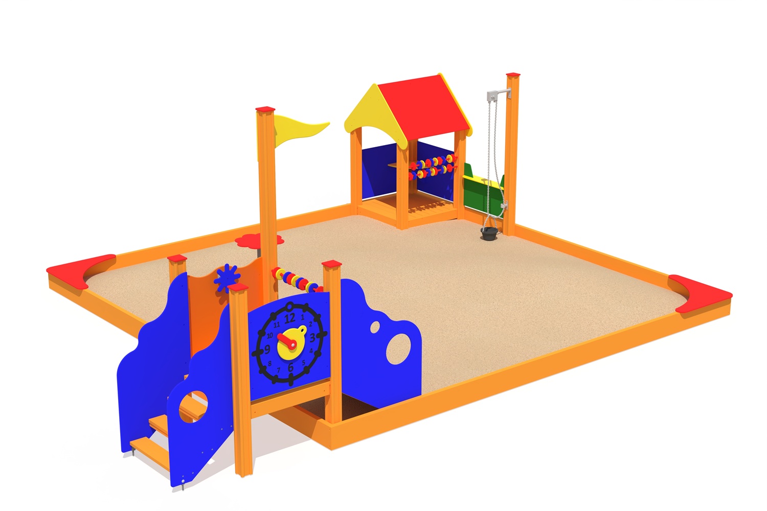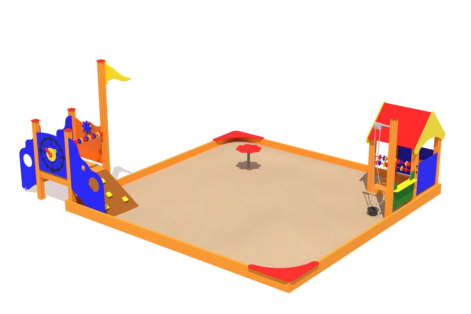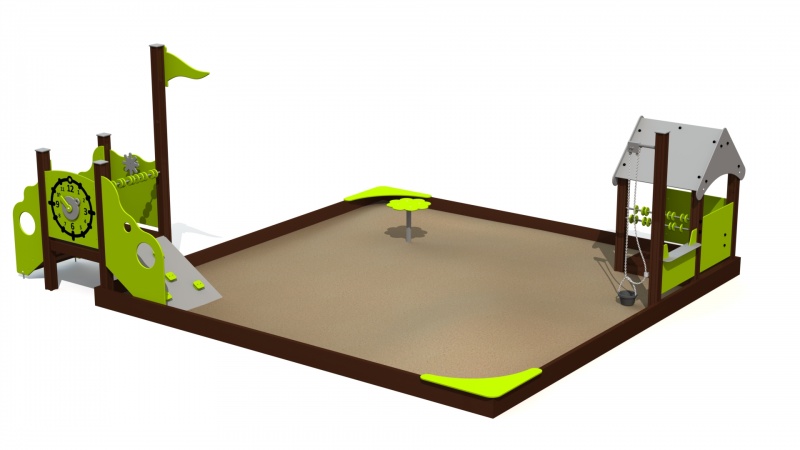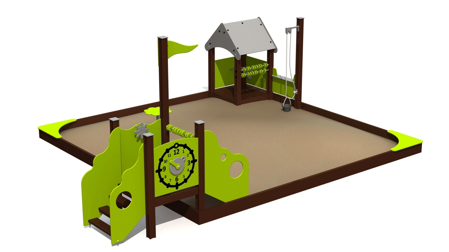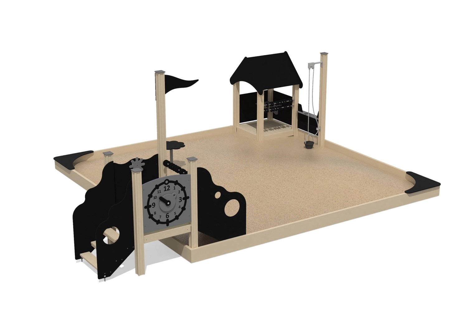 SandlĂ„dan innehĂ„ller ett litet lekbord och hörnpaneler för att baka sandkakor, medan det takförsedda lekhuset bjuder in till rollek med försĂ€ljningsdisk, kulram och sandhink. âïž
